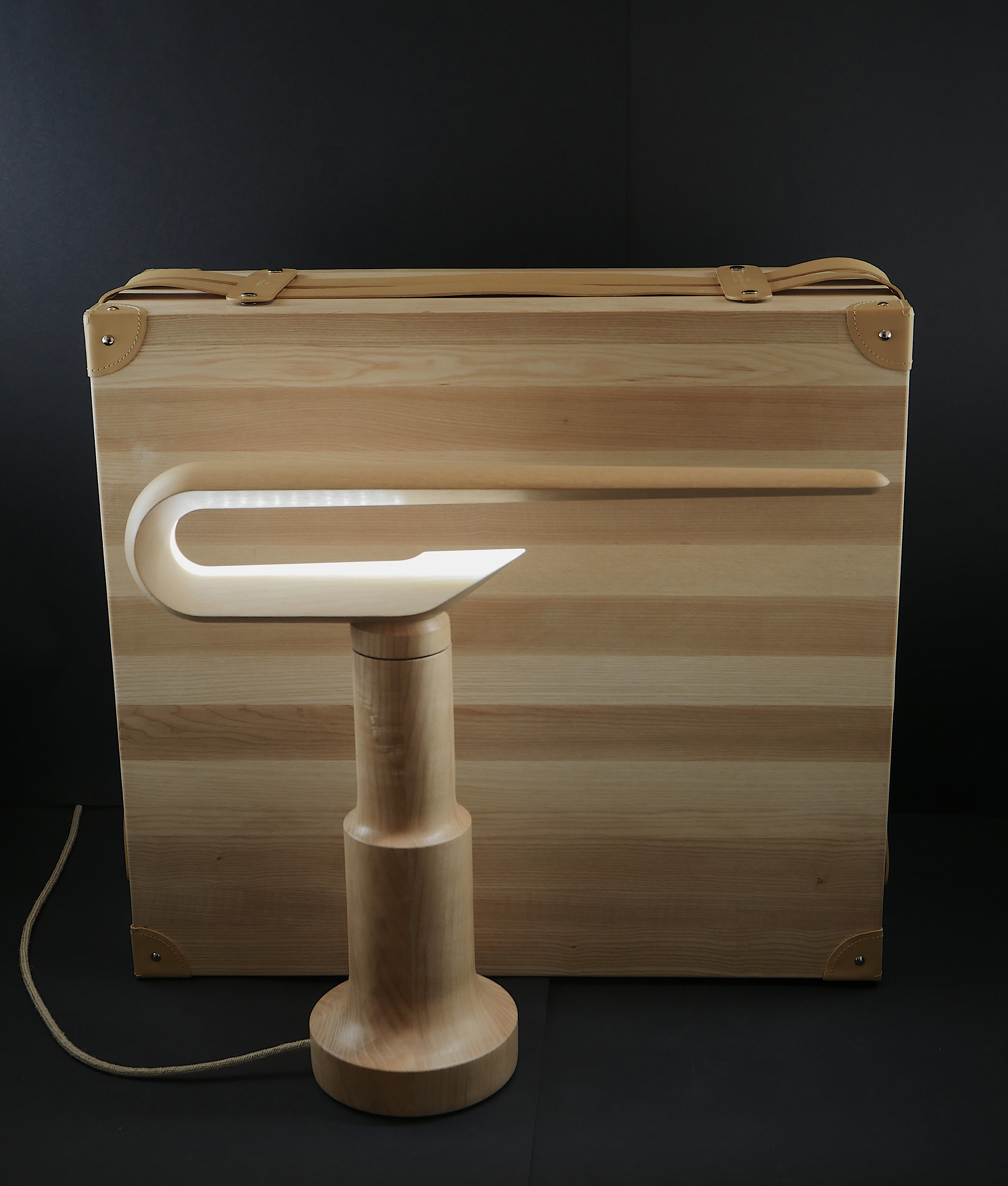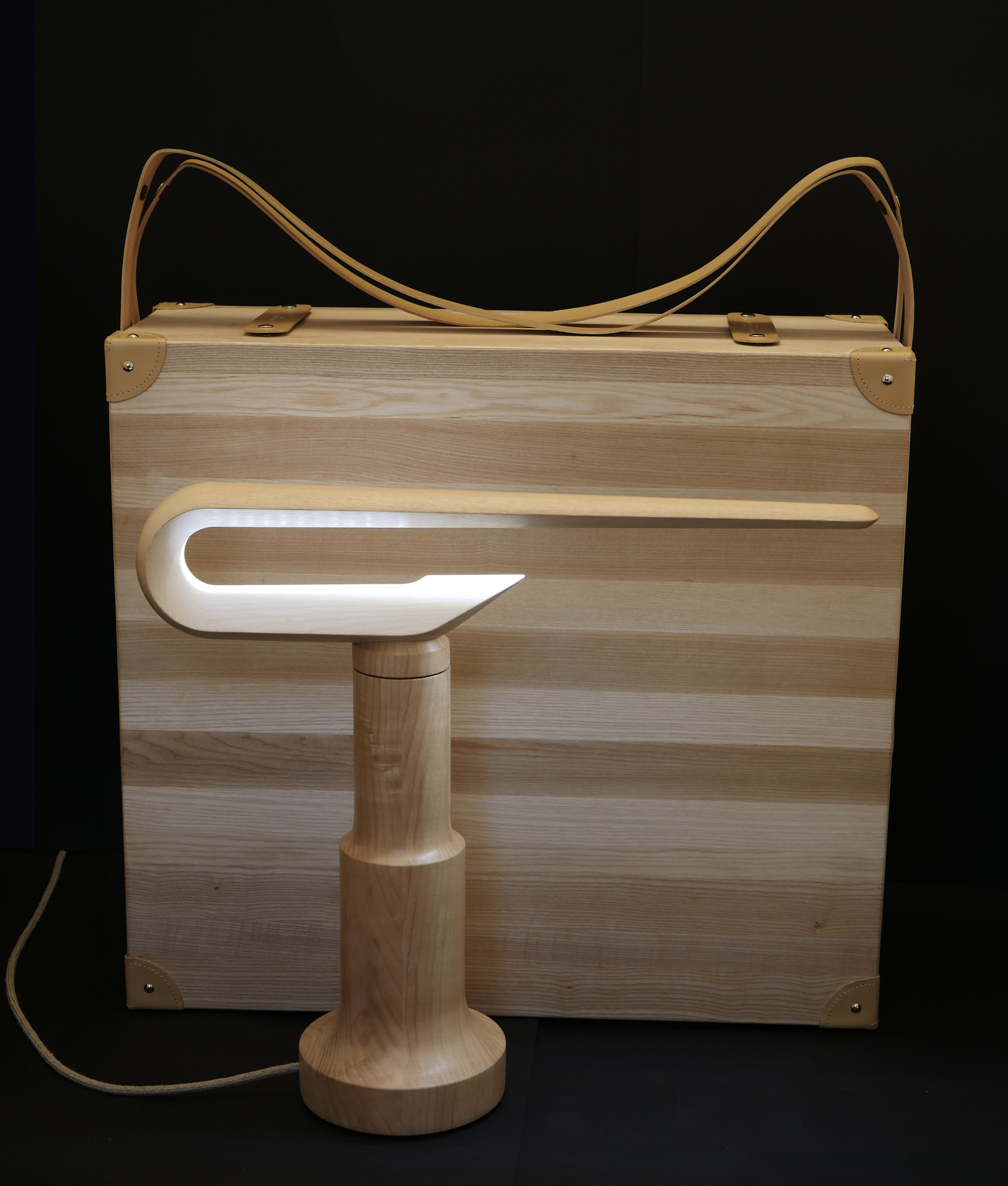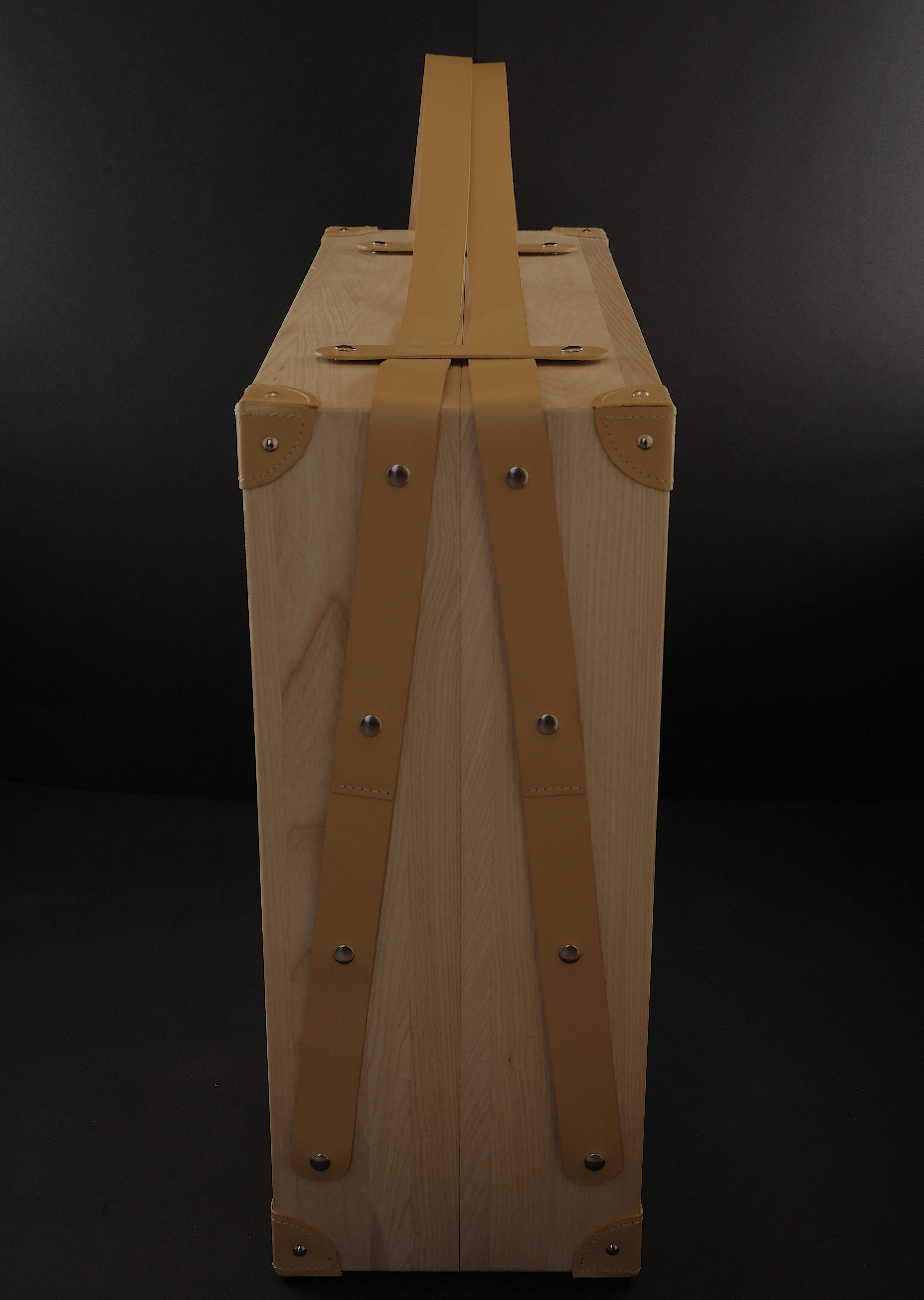 Valigia di presentazione TRUNK nella stessa essenza lignea, a accessori in cuoio