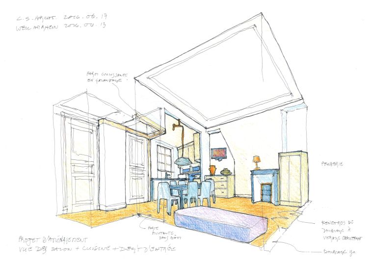 Un nostro vicino, uomo politico di sinistra e senza pretese, voleva rivedere il conforto del suo pied-à-terre parigino. Primo schizzo reso 02/2014. Due anni passano e gli presento l’ imprenditore che mi sembrava adeguato. L’astuzia del progetto è nella falegnameria. Per ricevere il vestibolo d’ingresso si apre sulla cucina e soggiorno tramite anti mobili. Per uso in seconda camera si chiudono a L.