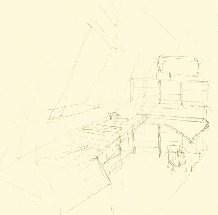 In Francia si chiama scambio di buona procedura. Per l’ amico fotografo che mi documentava una realizzazione recente momentaneamente priva di inquilina, ho riconfigurato, con le proprie mani, la sua cucina triangolare, piccolissima, sotto mansarda. Girando il frigo a 45° gradi (parallelo all’ ipotenusa) si guadagnava in larghezza per un forno, su piano scorrevole. In sequenza e a senso di orologio si realizzava un piccolo mobile, che si riempiva, e cosi via.