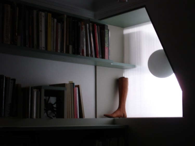 Ho sposato una persona per chi il libro riveste un senso molto particolare. Avevo già istallato due biblioteche per lei. Si trattava dunque della terza edizione, in un bi-locale rimodellato appositamente. Migliaia di libri riempiono scaffalature adatte al contesto spaziale. Finalmente sono architetture nel paesaggio quanto quelle disegnate da GANDY per SOANE.