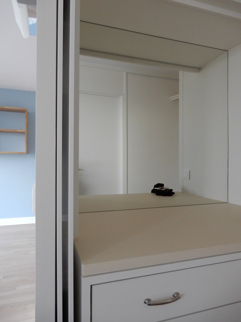 Un appartamento di 35m2 con vetrata a nord sui tetti del 14° arrondissement, che il committente desiderava munire armadi e potere dividere in zone distinte : dove si dorme e dove si riceve.