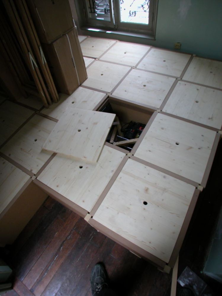 L’ esperienze delle barche a vela, dove ogni volume è sfruttato per depositare indumenti ecc. mi ha forse dato l’ idea di rialzare il livello del pavimento di 36 cm (2 gradini) per ricavarci dove mettere la biancheria e i vestiti fiori stagione. Ogni cabina corrisponde a un piccolo tatami sul piano di che si stende il futon. Lavoro da fare in due. Assistente : Sophie POENOU.