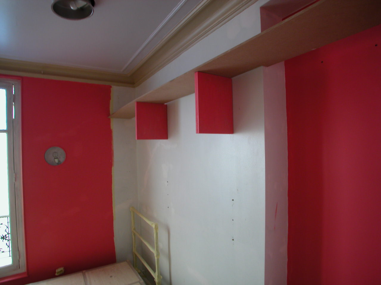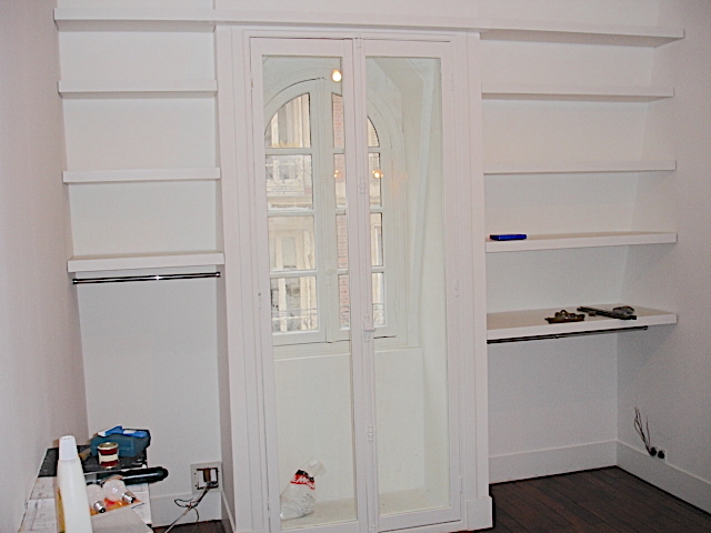 Con fissazioni nascoste si appendono dei panelli verticali alla pareti, e si stabiliscono le estremità del mensole. Esse ci si appoggiano o sono sospese sotto. Lavoro da fare in due. Assistente : Sophie POENOU.