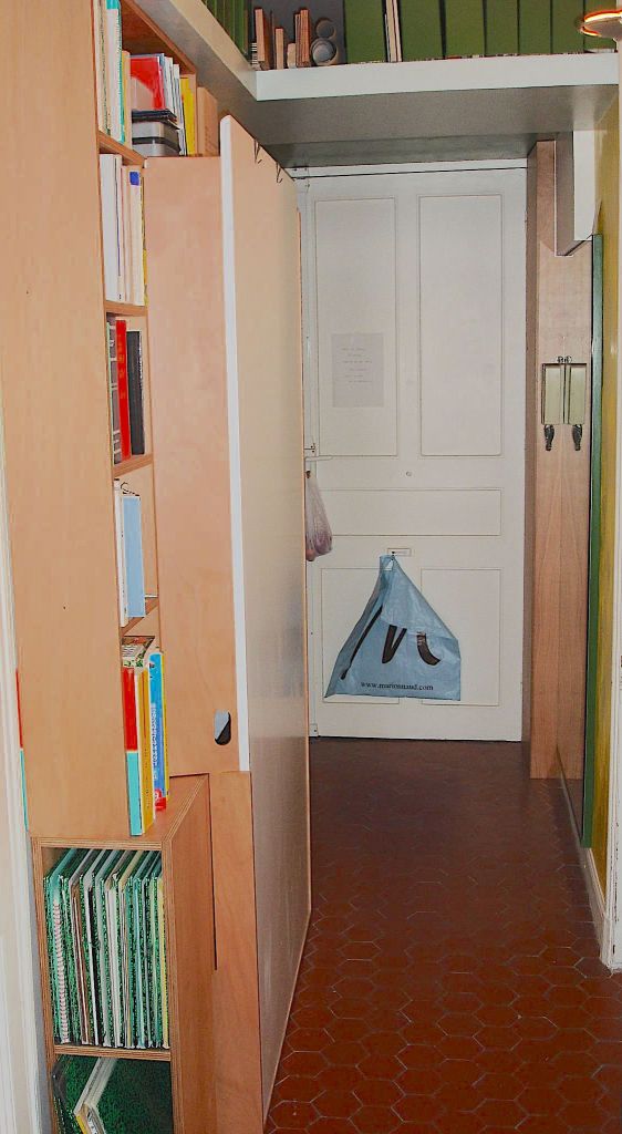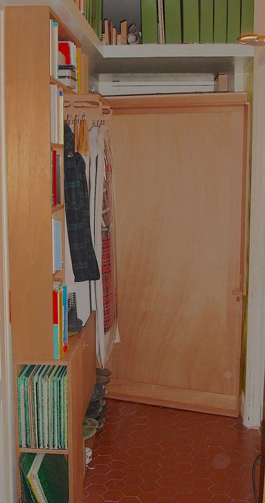 Largo di 120cm il corridoio offriva l’ opportunità di allestire una guardaroba e lasciare ampio passaggio. L’ ante di chiusura che separa dall’ ingresso serve anche da appendere immagini, tale che non si nota neanche l’esistenza dell’ armadio, circondato da libri e cartelli. Interamente realizzato con compensato qualità marina tagliato su misura incollato e verniciato al poliuretano senza nessuna fissazione meccanica tra i pezzi.