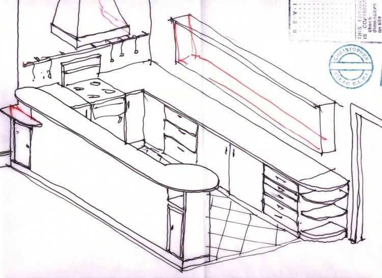 La divisione dopoguerra in singoli appartamenti delle grandi case londinesi ha configurato degli spazi insoliti e difficile da abitare. Tra amici interposti la committente mi ha chiesto una pianta da dare al falegname per realizzare la cucina. Cosciente del pessimo livello dei builder britannici e per evitare crepe di giuntura, il pannello schermante corrisponde alla dimensione massima disponibile all’ epoca (2,45*1,23).