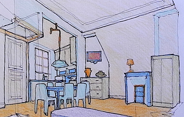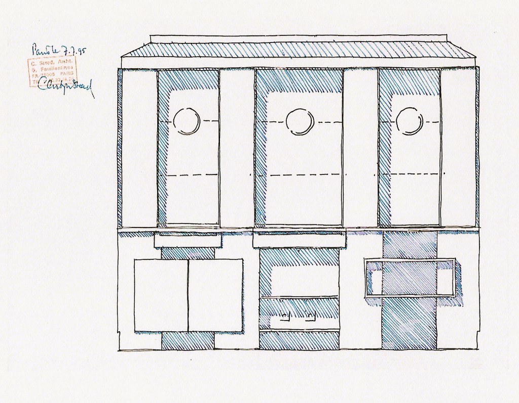 False colonne per dischi e la porcellana, cassetti (che aumentano la superficie di appoggio) per le posate e tovaglie, armadi a musica e bevande, scaffali al caldo davanti al termosifone. Realizzato a pezzi su disegno mio da RIVIERA CARPENTERS (Alpi Marittime, Francia) poi installato da me stesso. Istallazione complimentata 25 anni dopo con le sedie DAUPHIN e il loro tavolo.