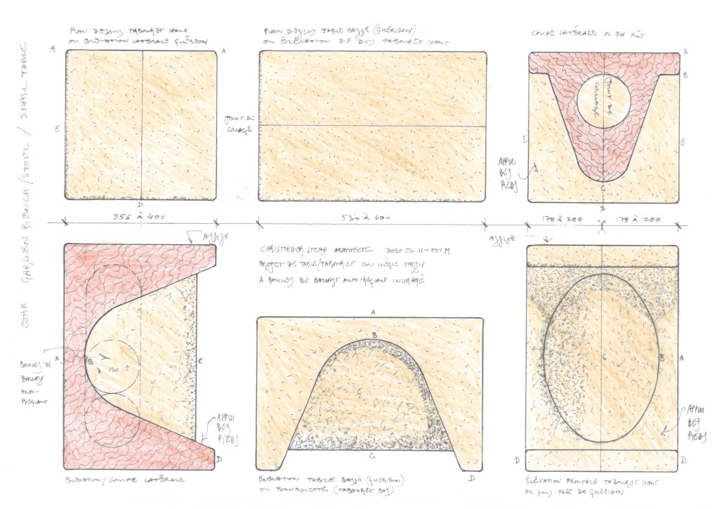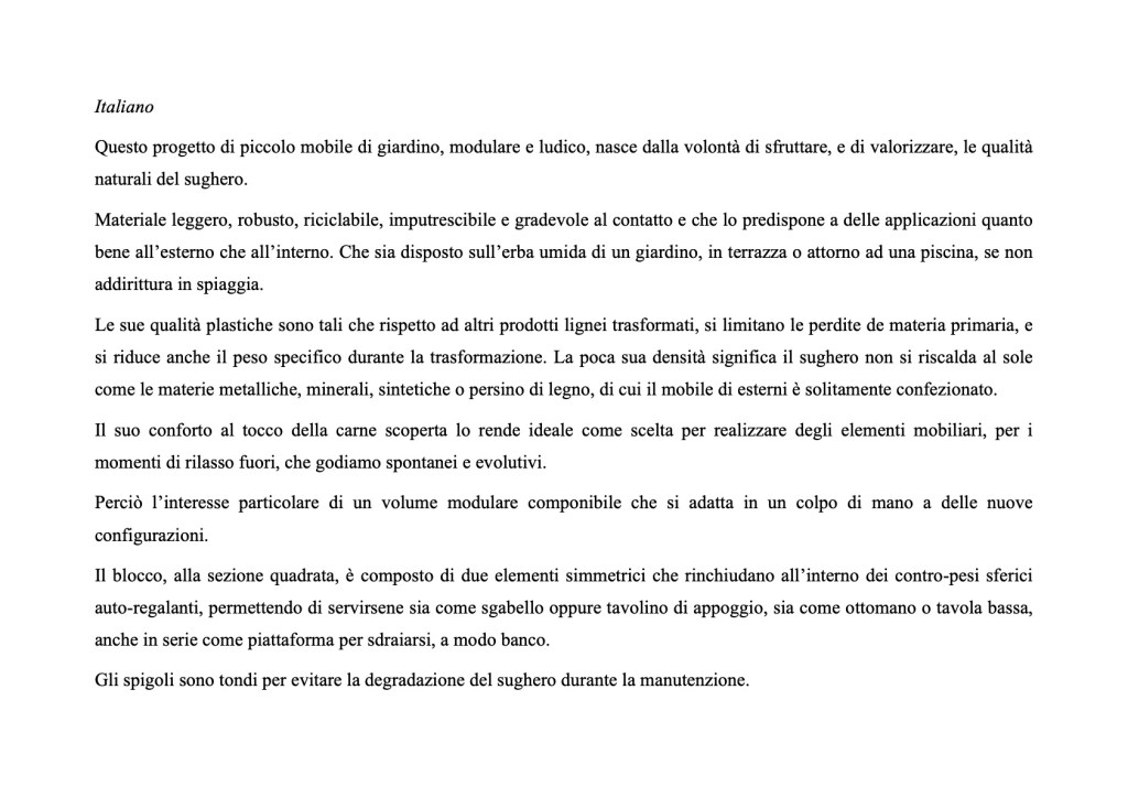 In viaggio in Sardegna con un’ amica architetto, ci siamo posti la domanda perché i locali — che coltivano il sughero — non utilizzerebbero piuttosto questo materiale naturale (termo-isolante, imputrescibile e riciclabile) invece di attrezzarsi di mobili PE e PP derivati delle industrie petroliere. Sottomesso a un’ azienda portoghese (RIVA Group) che lavora anche il sughero, questo schizzo avrà almeno permesso di soddisfare qualche curiosità.