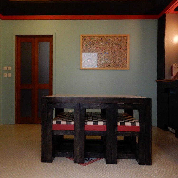 Nel 2016 ho cominciato a fare appello a un falegname parigino, per i mobili fissi di arredo specifico sui miei cantieri. Sarebbe l’ uomo a realizzare la cosa, dicembre 2017, che ho tinteggiata in nero esattamene come il buffet del 1995. Venti due e venti cinque anni dopo la stessa pittura TOLLENS era ancora buona da diluire, con trementina, per tingere in nero trasparente sia il tavolo che le sedie DAUPHIN che ci si infilano sotto.