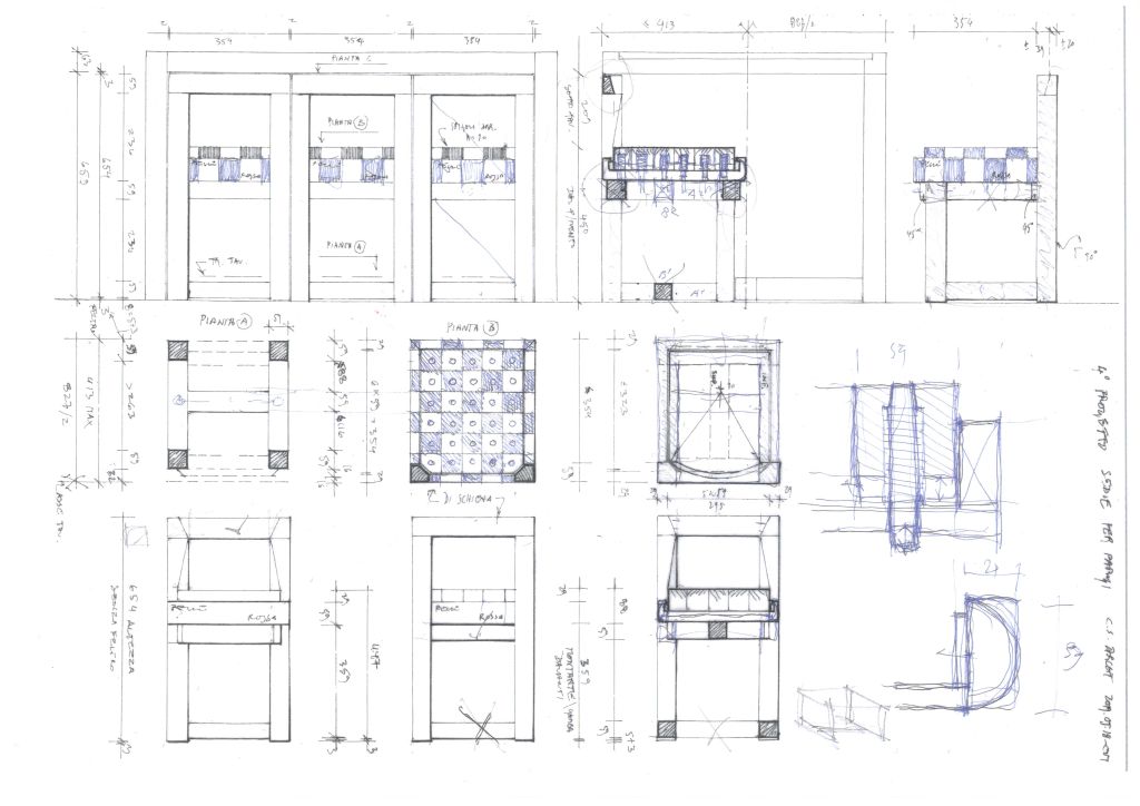 Pressapoco attorno al 1987 ho progettato un telaio per rimpiazzare il tavolo ligneo provvisorio che lo sosteneva. Mi sono ispirato di un modello di Josef HOFFMAN par la cantina degli operai di una fabbrica di progetto suo in Czechia. Il bello è che ci avrà consacrato pochissimi minuti, e così risulta poco prezioso, ben diverso dalla maggior parte dei suoi mobili. Sul momento un falegname locale non lo voleva realizzare il mio disegno, criticandone la costruzione. Ma è proprio quest’ aspetto costruttivo che mi interessava nel modello.