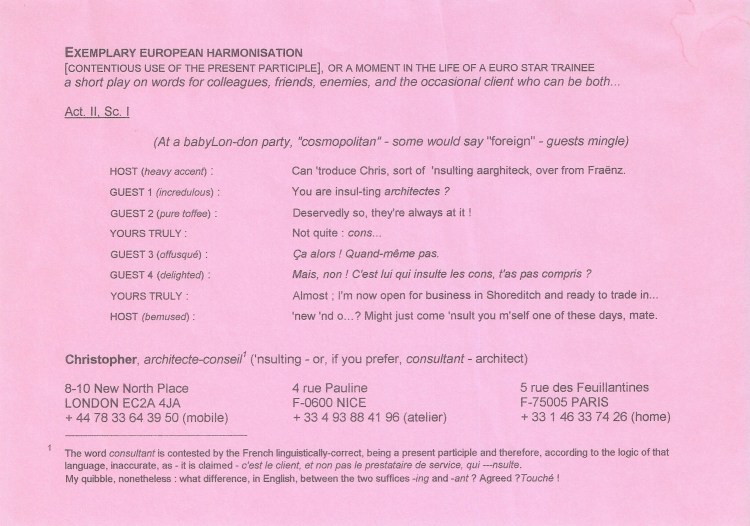Italiano : Avendo già cominciato a lavorare come intermedio tra persone con culture professionali ben distinte, ero deciso di istallarmi a Londra (grazie au collegamenti in treno sotto la Manica) per servire un mercato — di committenti e i loro prestatori — che non si capiva, o faceva finta di non capirsi. Ecco come ho annunciato la mia istallazione ufficiale presso le conoscenze.