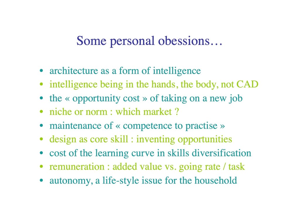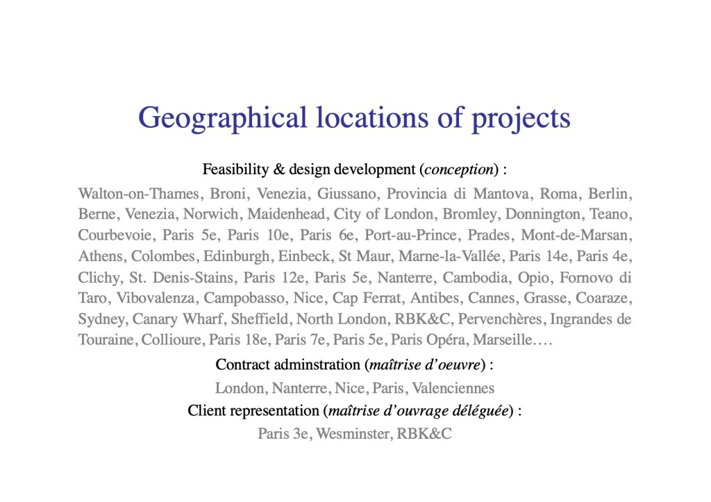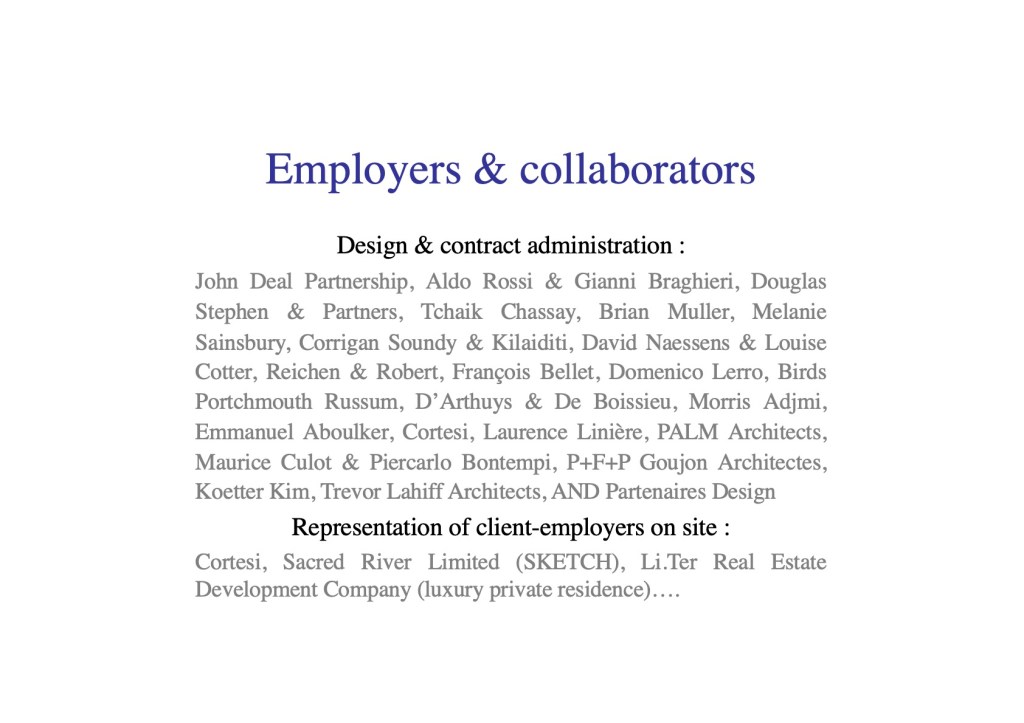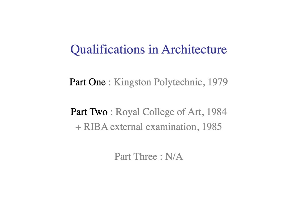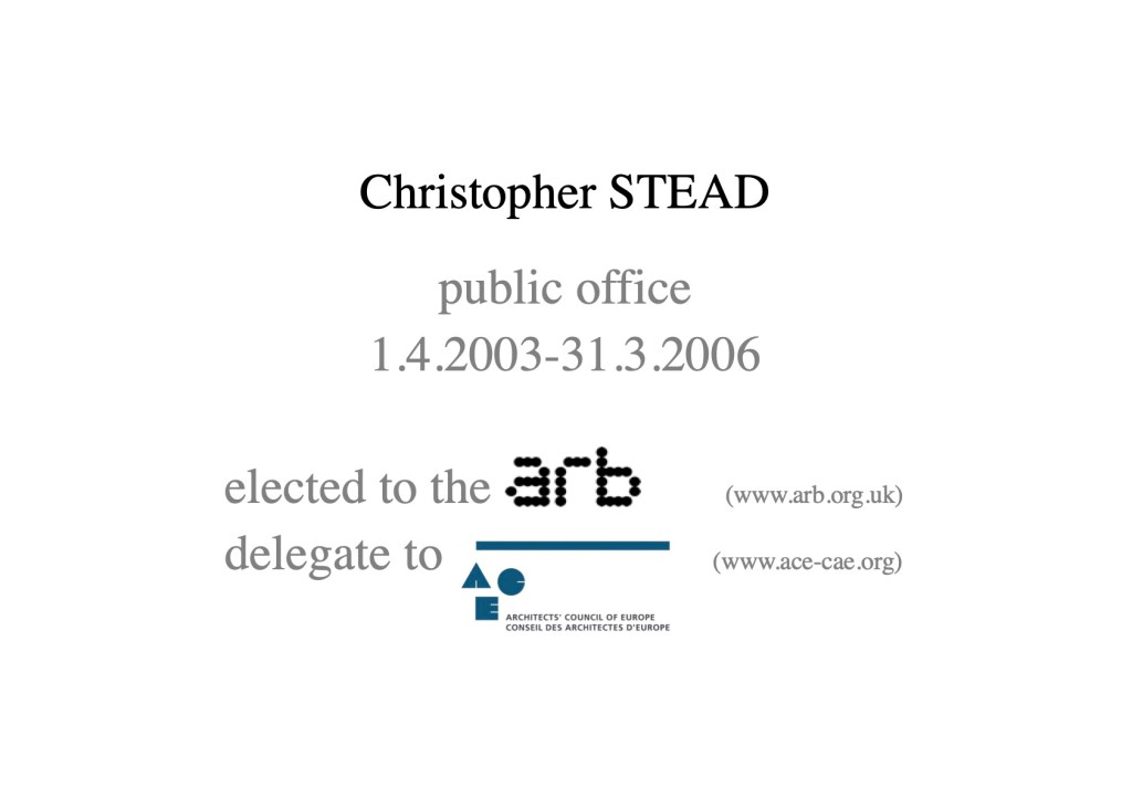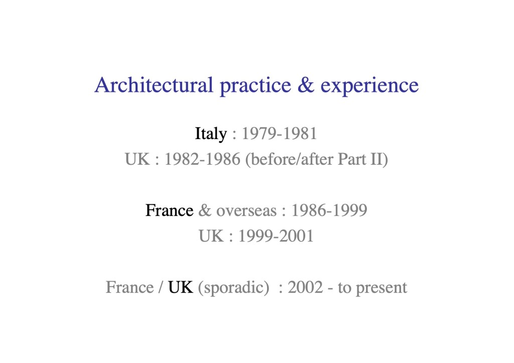 Dal 2003 al 2006 avevo un profilo pubblico presso gli architetti del Regno Unito, in quanto architetto eletto presso il regolatore della professione ARB. Tramite Mike RUSSUM, che insegnava ogni tanto a Nottingham, sono stato invitato a fare una presentazione agli studente RIBA Part III, sulla mia esperienza di carriera in quanto architetto con attività internazionale.
