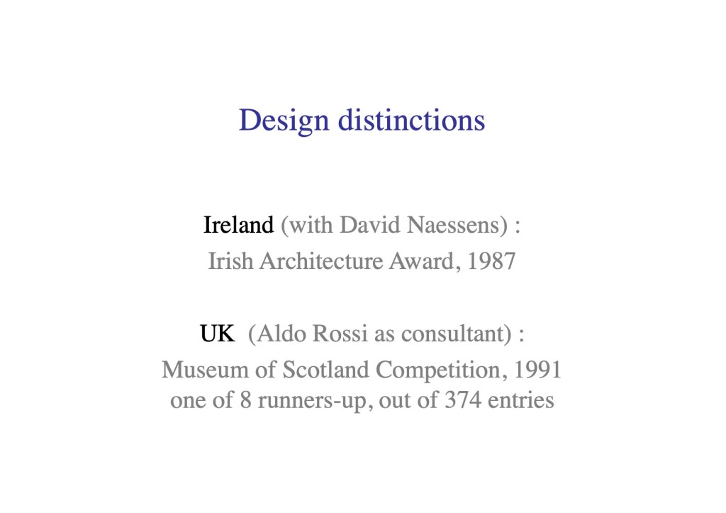 Oltre qualche invito in ruolo critico presso scuole di architettura, devo a dei colleghi irlandesi e italiani delle opportunità di discorrere sull’ architettura di Aldo ROSSI, e qualche volta anche sulle mie opere.