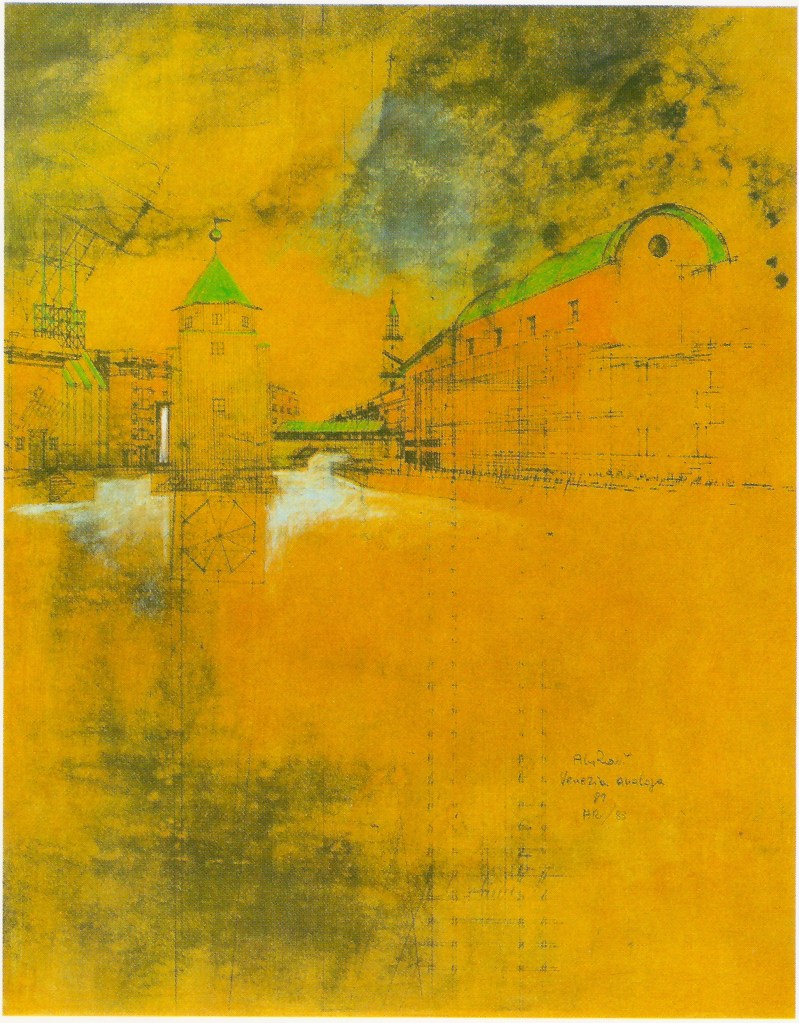 Nel 1982 l’ architetto britannico Martin LAZENBY e The Institute of Contemporary of Arts a Londra mi hanno chiesto una mano per costituire una esposizione monografica su Aldo ROSSI. Mi sono reso a Milano per scegliere lucidi e farne tirare copie da esporre. Ho proposto a AR che faccia, dopo l’esposizione, donazione delle eliocopie dei progetti esposti alla Heinz Collection, archivio di architettura gestito da RIBA. Tra l’ altro Aldo voleva vedere i disegni di Robert ADAM, che ci si trovavano. In visita a Londra con la figlia Vera, gli ho condotti lì per un’ appuntamento che avevo preso di anticipo. Alla fine della consultazione dei disegni di ADAM, la curatrice ha chiesto ad Aldo ROSSI un disegno suo per la collezione, domanda che ROSSI ha accettato di soddisfare. L’ apprezzamento del dono offerto era tale che RIBA ha editato una cartolina, finalmente di un disegno mio, colorato in modo eccezionale da Aldo, che ho scoperto inquadrato da amici. (Ho subito comprato il resto dello stock, già quasi esaurito.) Anche se RIBA ne rivendica il copyright, c’è da dire che il capriccio Venezia analoga era un’ idea mia che, visto i prezzi praticati (70kE per un’ opus simile nel 2017) ha ampiamente rimborsato tutto quello che il mio trattamento avrà mai costato allo studio ROSSI.
