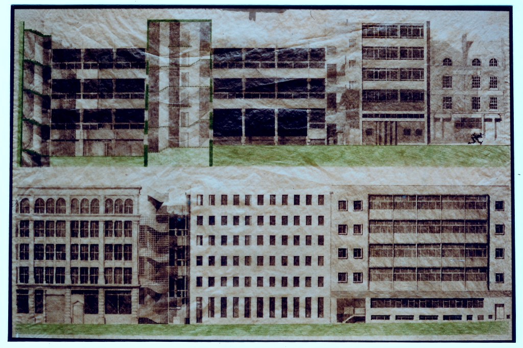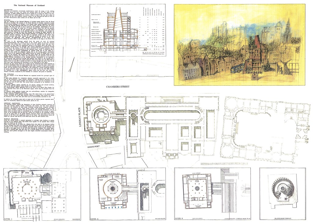 Il Museo della Scozia, con Aldo ROSSI (architetto consulente), esposizione di due studi di facciata colorati da me eseguiti a Milano, nello studio di Sta. Maria alla Porta 9. (Originale in collezione personale, Parigi.)