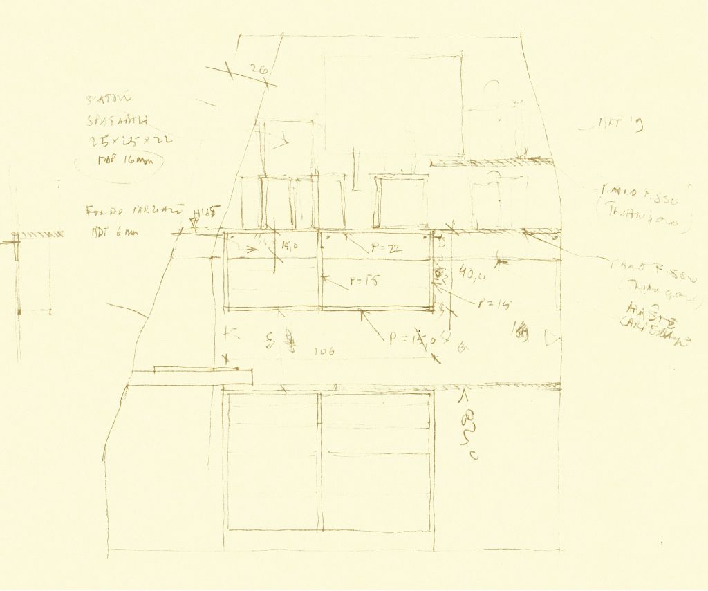 Echange de bons procédés s’imposant, j’ai réalisé avec mes outils portatifs et mes propres mains la transformation de la cuisine d’un photographe, ami de longue date, pendant qu’il habitait les lieux et s’en servait tous les jours. Outre ces croquis, il n’y a pas de dessins préparatoires de cette réalisation, astucieuse, à coup par coup.