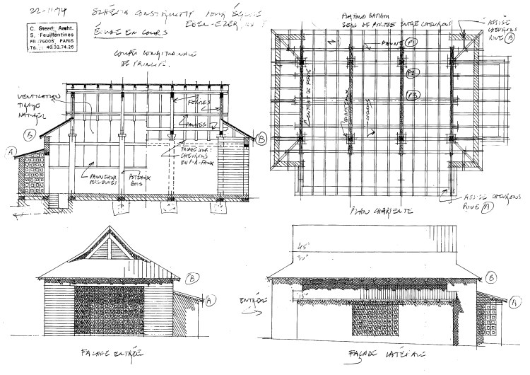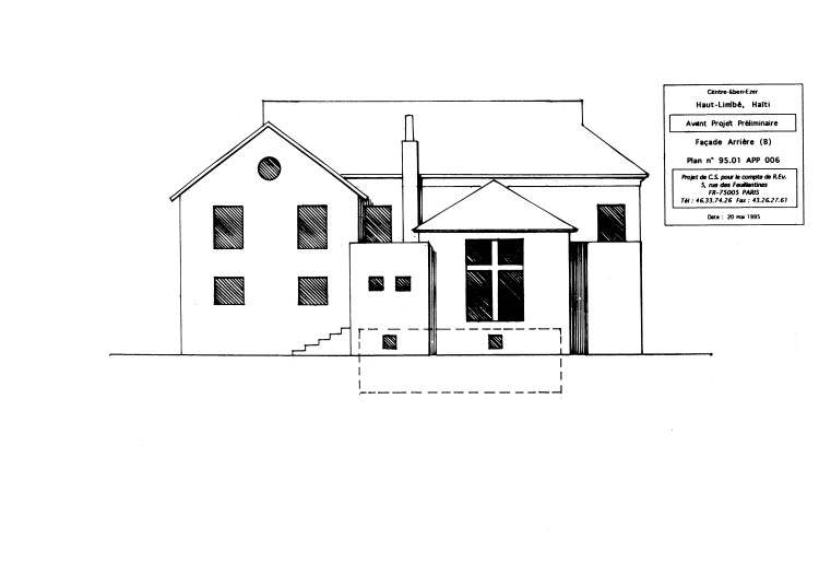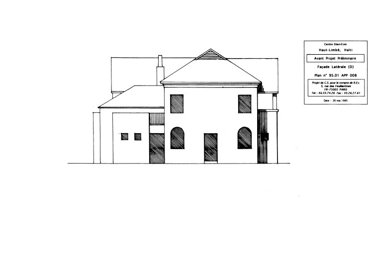 FR : Etant donné que je n’aurais aucune opportunité de contrôle sur la mise en oeuvre, l’adoption d’un schéma agrégatif d’éléments symétriques me paraissait la ligne conceptuelle à suivre. Peu importe si la taille et la proportion des baies résulteraient peu conformes au dessin, du moment que la notion de symétrie approximative informait l’ordonnancement de l’ensemble.