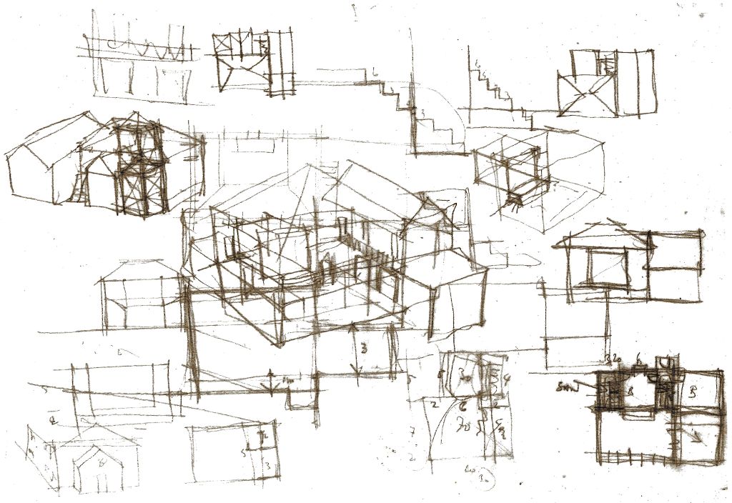 ENG : Given that I would have no controlling opportunity to inspect building work, the adoption of an aggregative scheme of symmetrical elements struck me as the best way to proceed conceptually. Little matter if the size and proportion of openings bear little resemblance to those drawn, from the moment that the notion of approximative symmetry inform the general ordering of the whole.