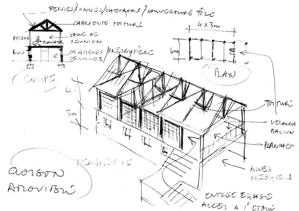 Son idée-programme, que l’église ne soit pas uniquement un lieu de culte dominical, mais aussi un dispensaire de vivres et de suivi médical, résonnait avec la motivation qui m’avait conduit en MBA peu auparavant. J’avais depuis créé une association 1901 pour encadrer mes activités bénévoles (de conception et de maîtrise d’oeuvre, entre autres) en faveur des moins fortunés. Tenter de l’ aider, par une esquisse architecturale qui pourrait être quantifiée avec réalisme, me paraissait donc normal.