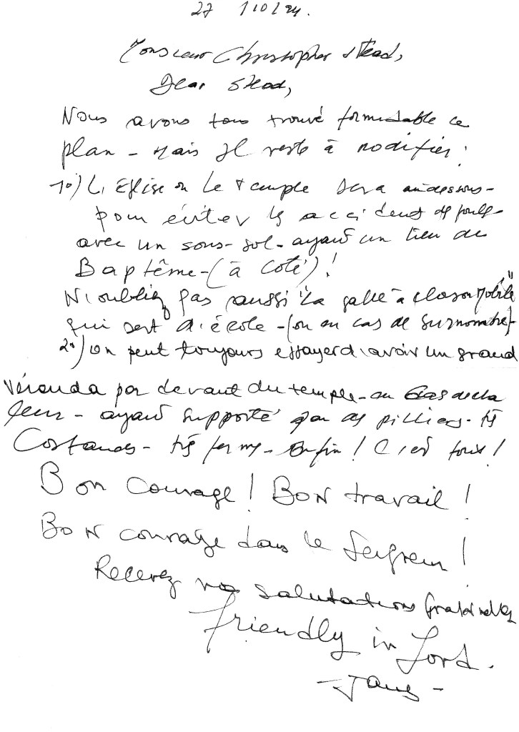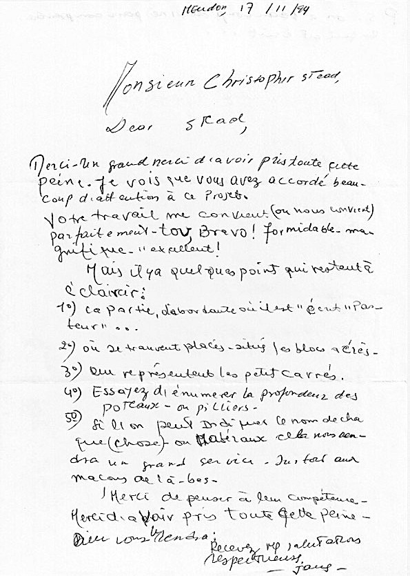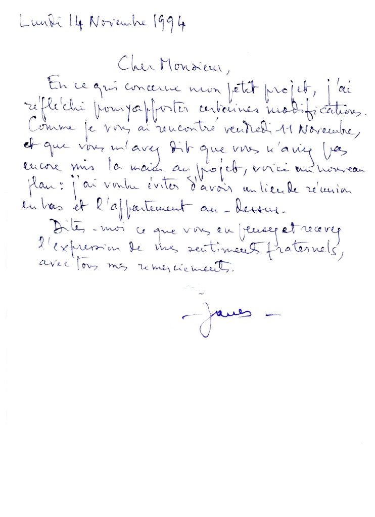 En octobre 1994, pour amorcer le dialogue, j’ai jeté quelques lignes sur papier, pour voir si on se comprenait, question pas évidente ni pour lui ni pour moi. J’ ai précisé que ce n’ était pas une solution étudiée, mais une image d’ après indications de ce que l’ on pouvait soupçonner comme démarche leur convenant. Voici sa réponse.
