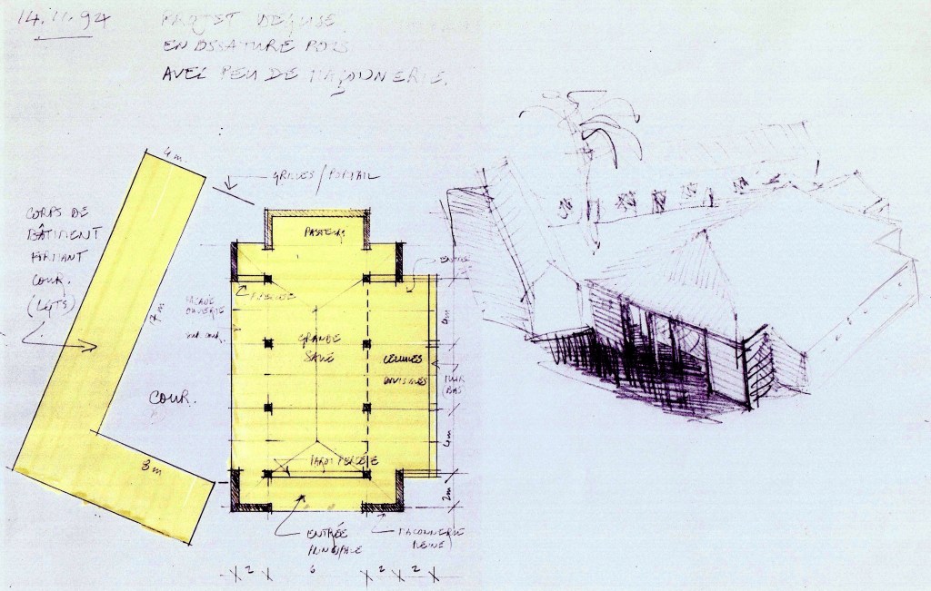 Quelques jours plus tard j’ espérais pouvoir clarifier les points d’ interrogation avec un jeux de plans, façades et coupes, en date du 22 novembre 1995. La couverture j’ imaginais en tôle métallique galvanisé, matériau typiquement disponible. A part que, gamin, j’ai toujours aimé la tôle ondulée, telle qu’employée et peinte sur des corps de ferme en Ecosse, l’ exemple d’ Aldo ROSSI m’ avait persuadé que c’est aussi une couverture de choix, pour des architectures que l’on voudrait simples et dignes.