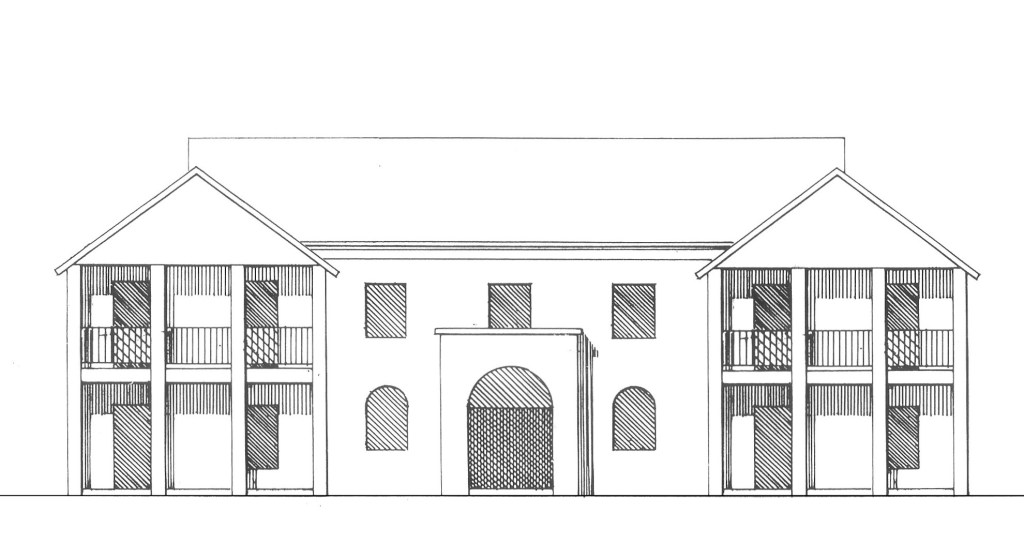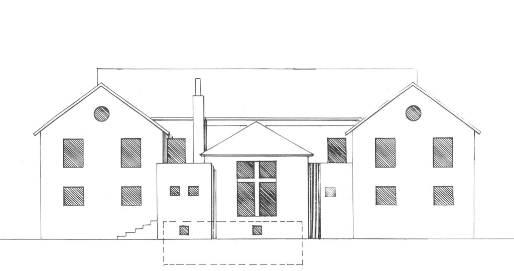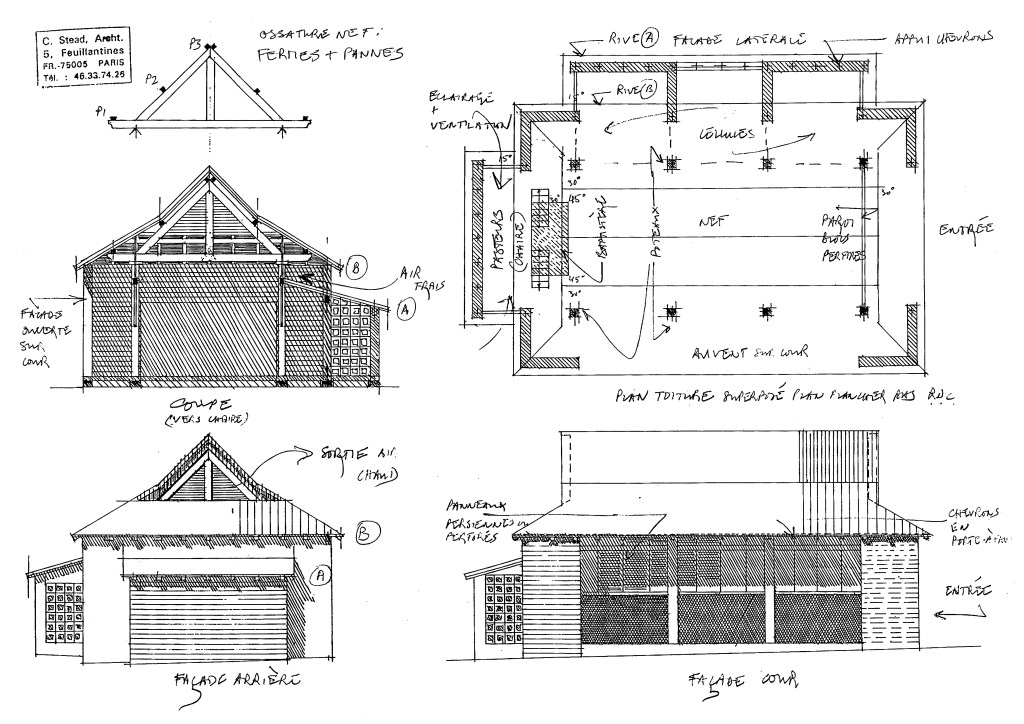 A vrai dire James en était horrifié, et j’ ai fini par comprendre pourquoi : la volumétrie, les pignons aveugles et les matériaux ‘pauvres’ pouvaient rappeler la construction dont l’assemblée disposait déjà ! Comme si par télépathie j’avais transcrit en dessin une réalité jamais vécue par moi-même (voir photo infra), mais qui leur était familière.