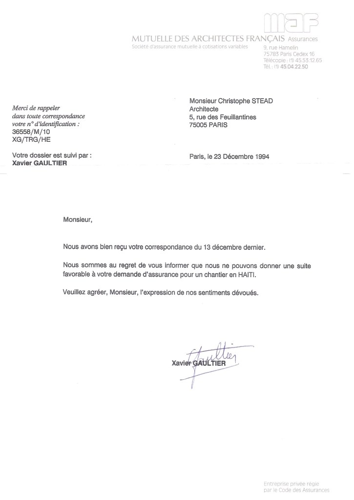 Je retiens néanmoins que cette esquisse possédait un vrai potentiel, de réaliser un belle oeuvre avec peu de moyens, si l’ on avait été en position d’ en maîtriser la mise en oeuvre. Mais tel n’ avait jamais été mon propos, ni dans mes moyens. Mon assureur RC professionnel m’ a d’ ailleurs infirmé de pouvoir me couvrir pour un chantier en Haïti. Il fallait donc trouver une autre manière d’ arriver au but.