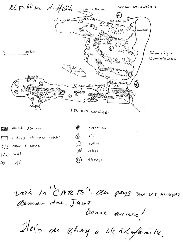 De son côté James VIXAMAR a communiqué d’autres éléments afin de m’ aider dans ma réflexion, dont un grand panneau de feuilles scotchées les unes aux autres ou il avait tenté d’ esquisser un volume ressemblant à une église de missionnaires, avec clocher, parquets intérieurs et baie d’entrée cintrée. Ainsi que cette ‘carte du pays’ tout aussi charmante.