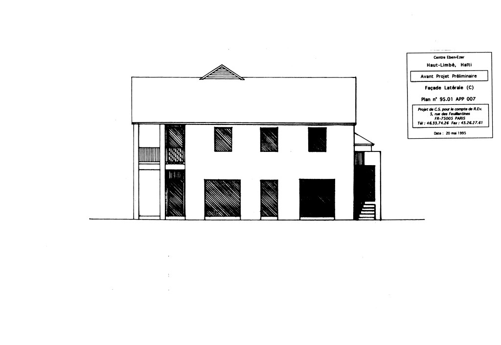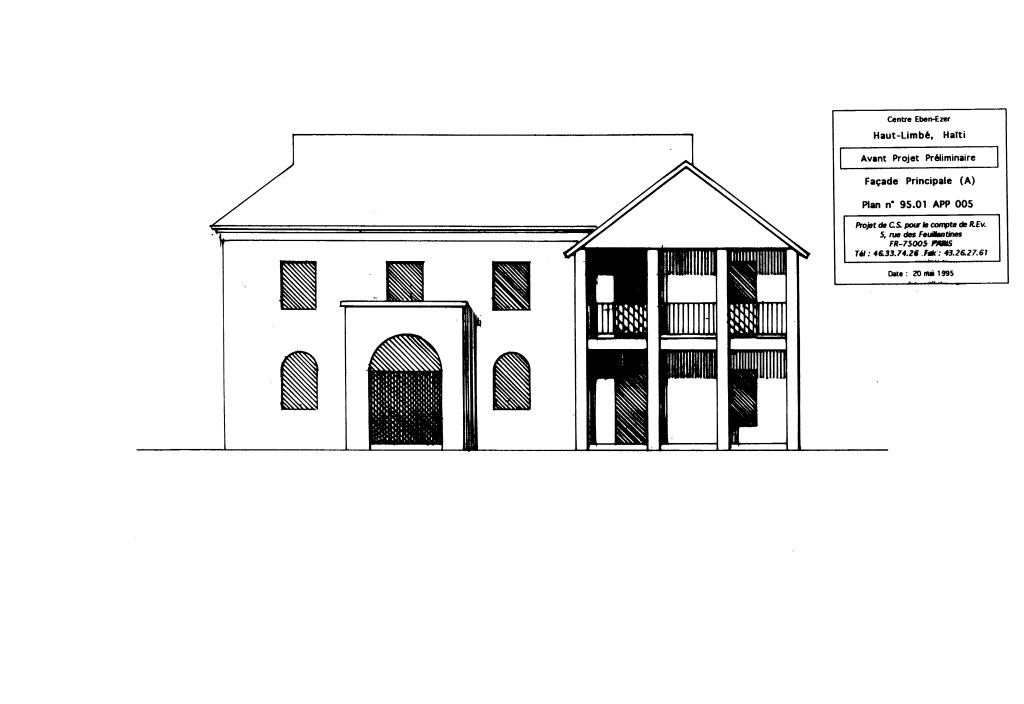 Pour satisfaire la demande de locaux supplémentaires, j’ ai réalisé un ou deux collages des façades principale et arrière, en rendant la composition symétrique. (Même logique que pour le projet de maison à Port-au-Prince, en 1989.)