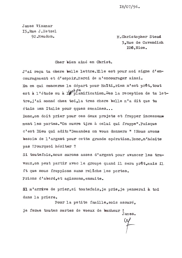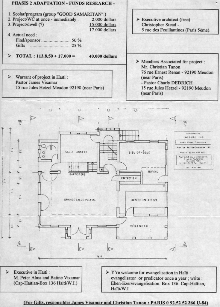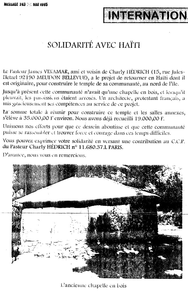 Dès que j’ai perçu le pasteur haïtien, James VIXAMAR, s’adresser à la congrégation baptiste du Point du Jour à Boulogne-Billancourt, j’ai été ému. Homme courageux, il cherchaient en Hexagone des financements pour un centre paroissial à Haut-Limbé, au Cap-Haïtien, dans son pays natal.