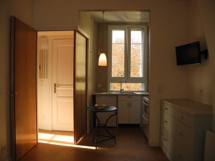 Une chambre à l’arrière, pouvant servir de salle de conférence à point d’eau est devenue la cuisine & salle à manger en mode habitation. De même, l’ancienne cuisine, transformée en studio pour les collaborateurs de passage, sert de dressing.