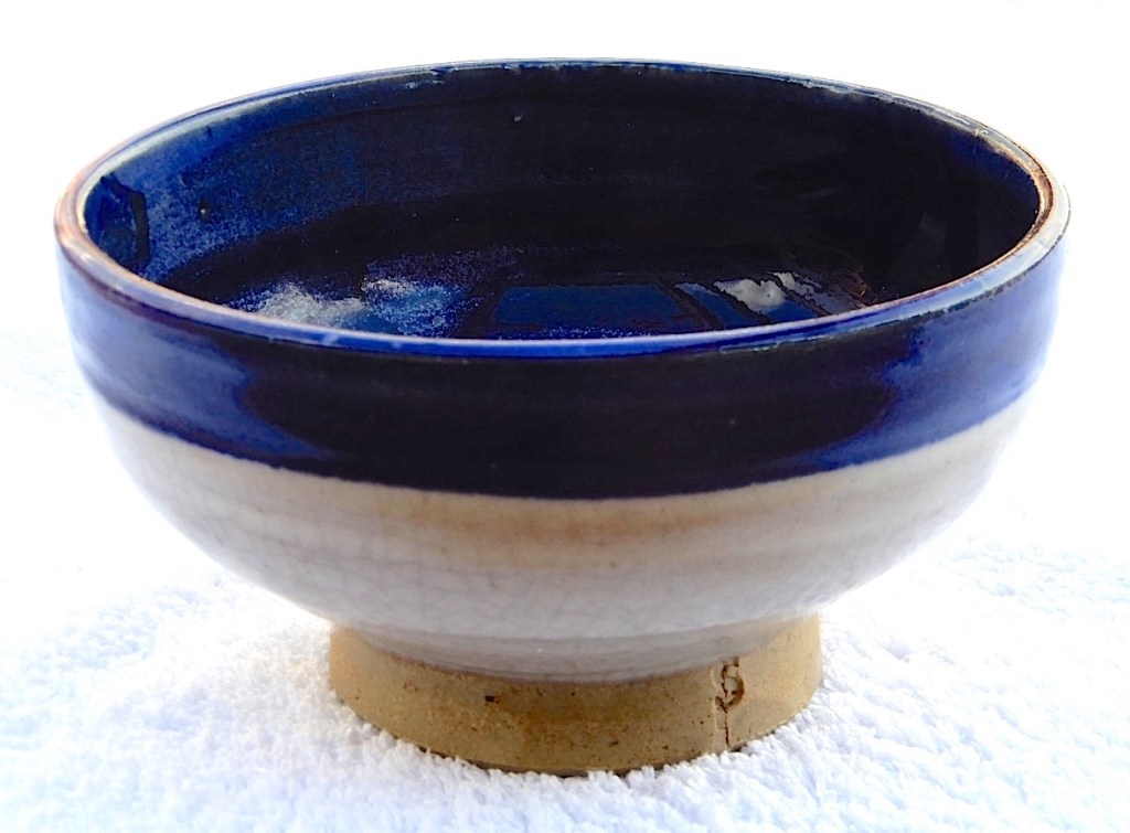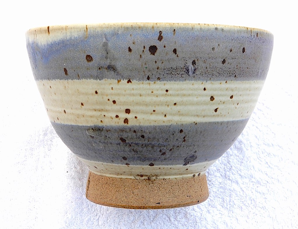 Grès, émail blanc cassé, baguage bleu, pigments mouchetés
