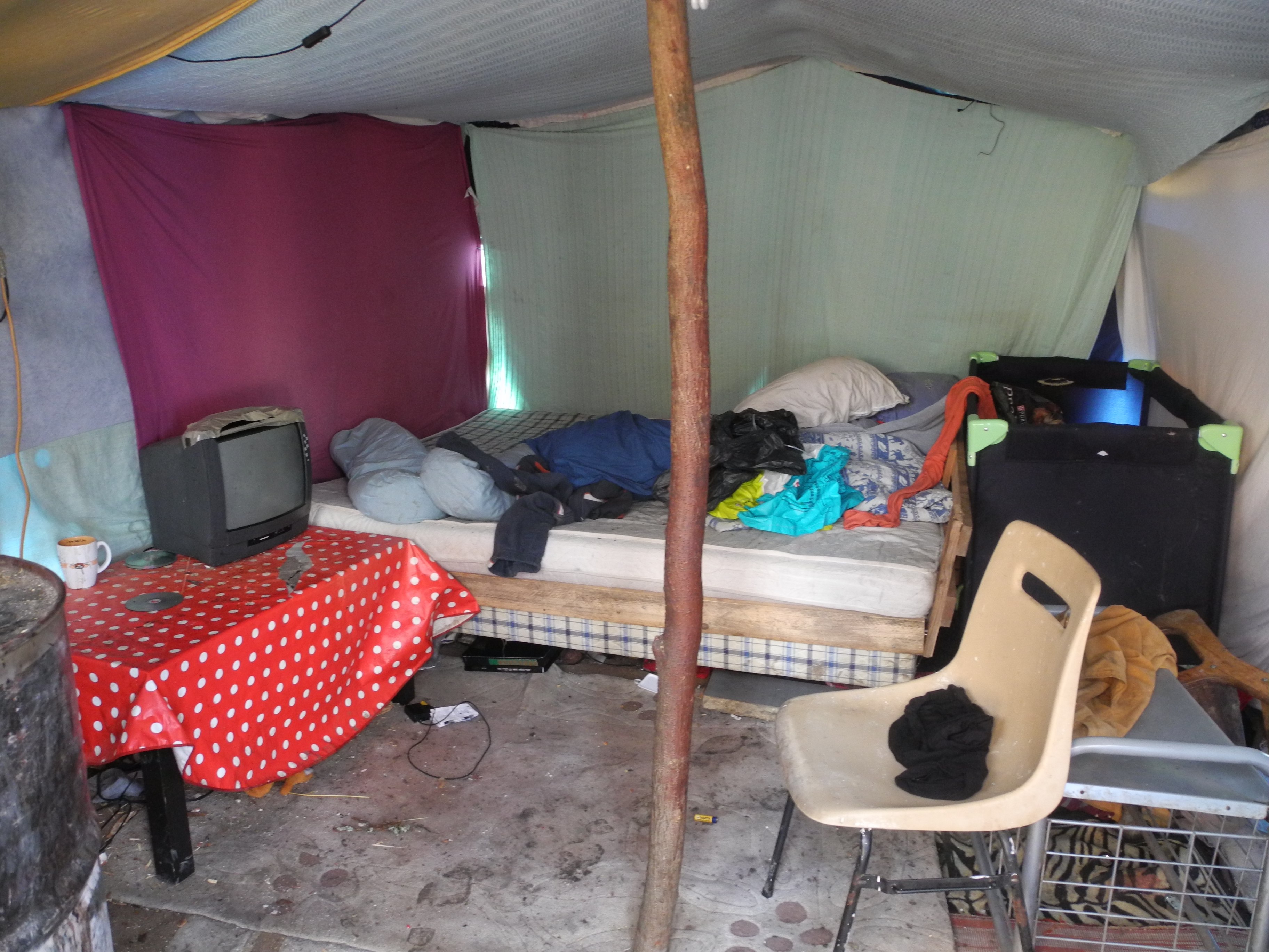 Being an architect, sworn into a profession entrusted with upholding the respect of planning and building regulations, I declined to assist in the construction of a new camp, when the old one was due to be bulldozed by the local authority. (I did nevertheless take a night bus to be there before dawn on the day, just in case.) The excavation of a dry-pit toilet, to reduce the risk of inadvertently treading on someone’s excrement (whenever I returned home from a visit, my shoes stank and I had to wash them) was however executed within 24h of my making the suggestion.