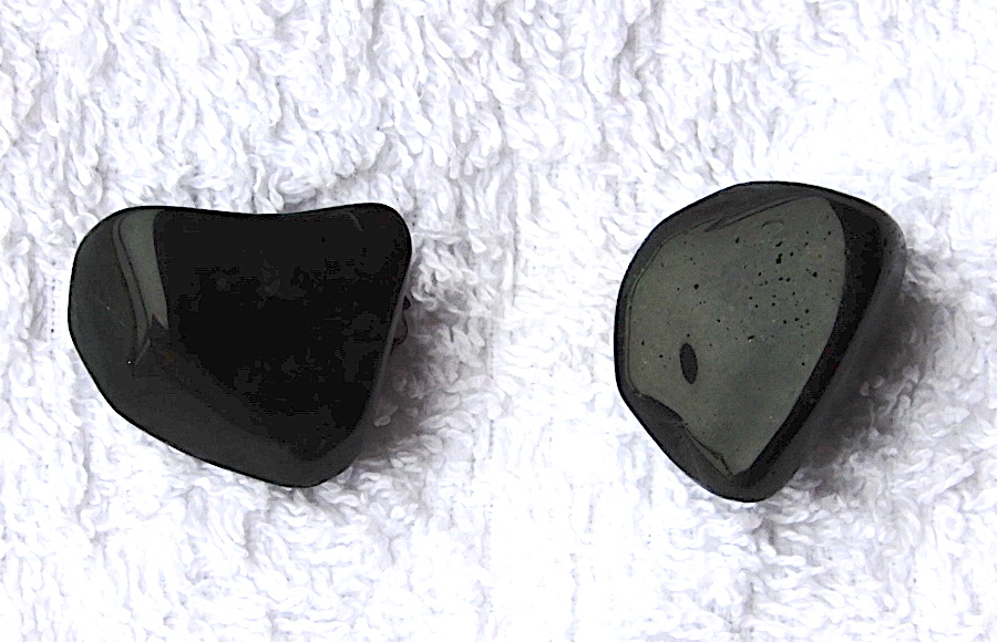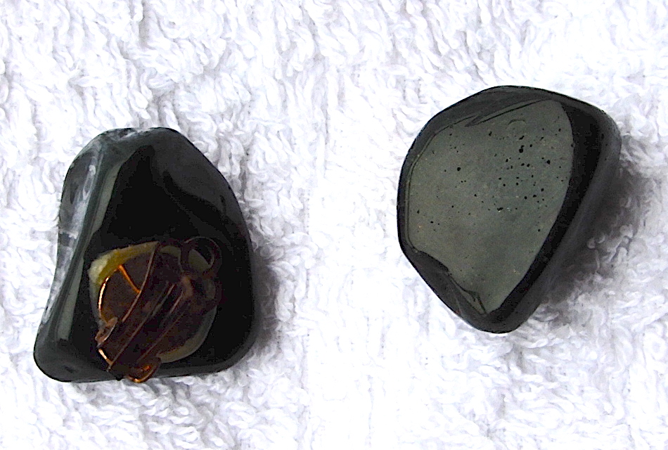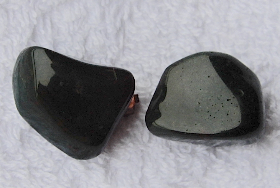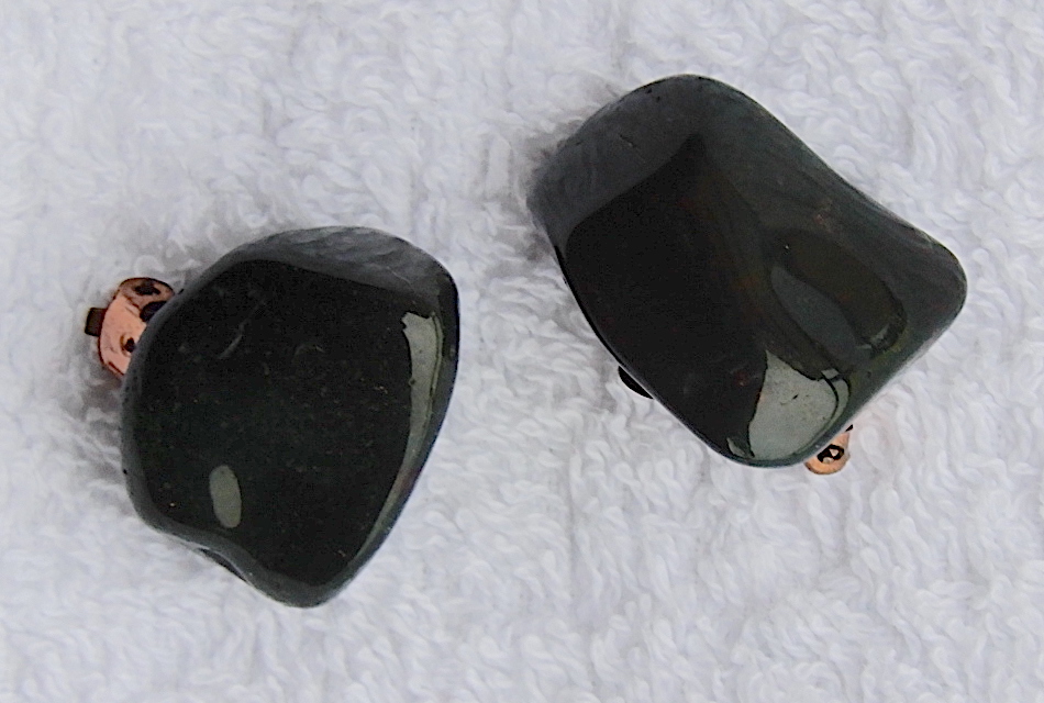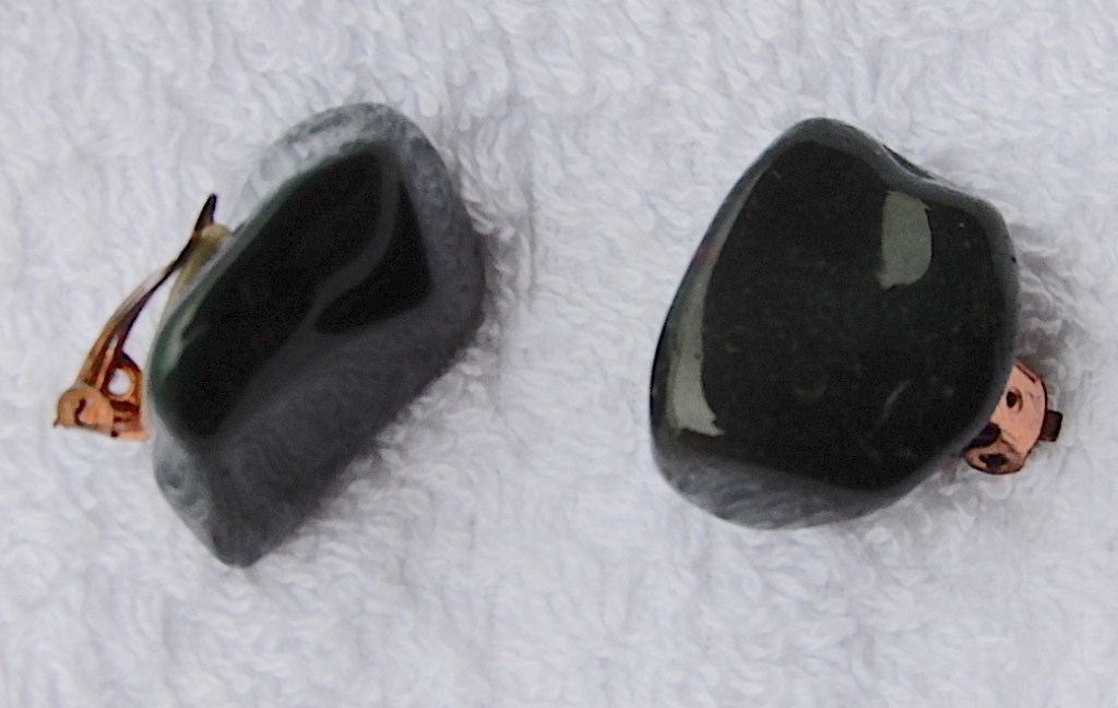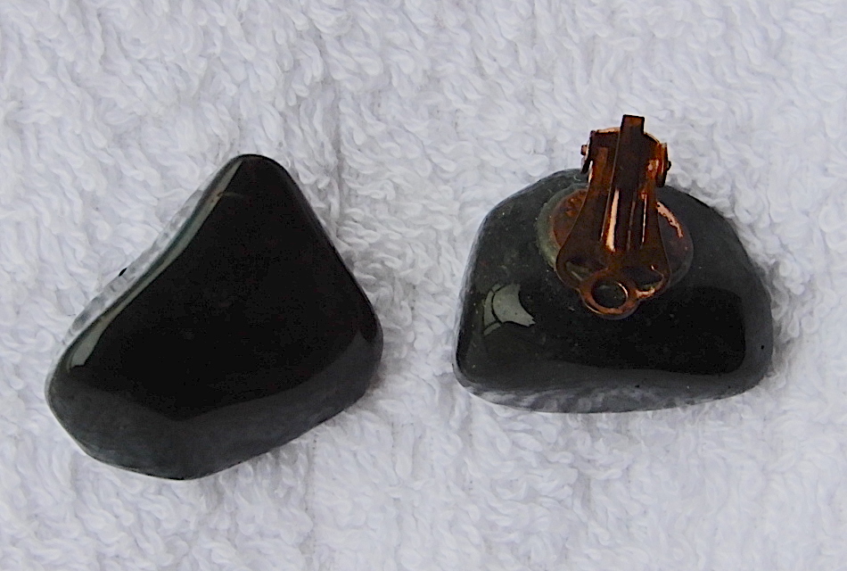 Green Serpentine earrings, perhaps the only sample available. Thanks to an electric, motorised, tubular grinder, which I would fill with pebbles gleaned from beaches in Scotland and elsewhere, I disposed of a ready supply of polished stones. The polishing process might take several weeks. With pocket-money I would buy glue and metal accessories, to make gifts for family friends.