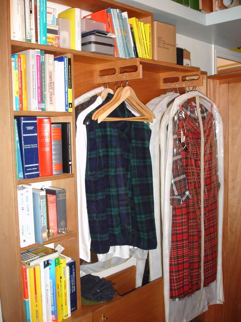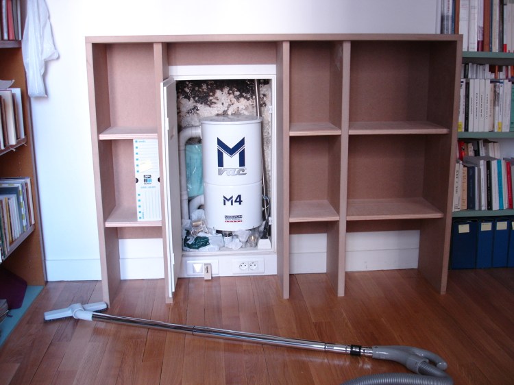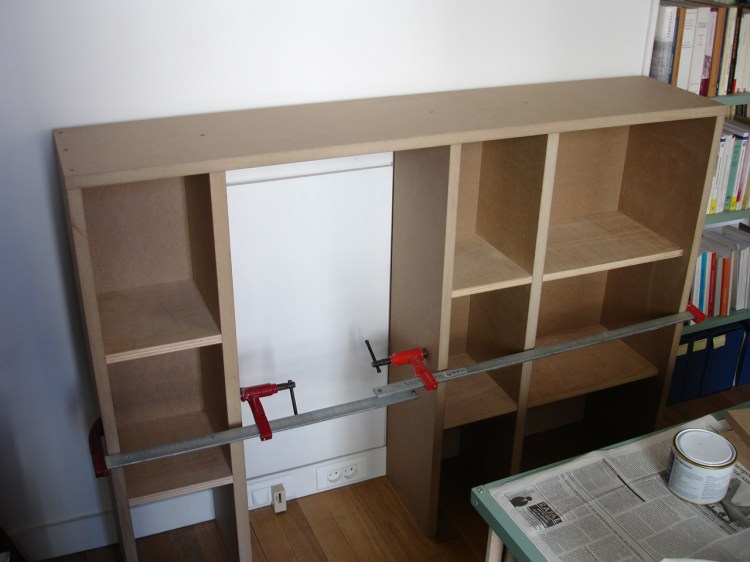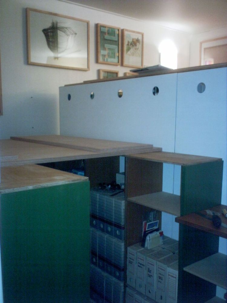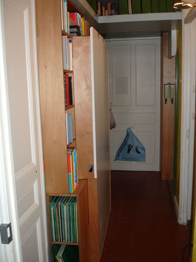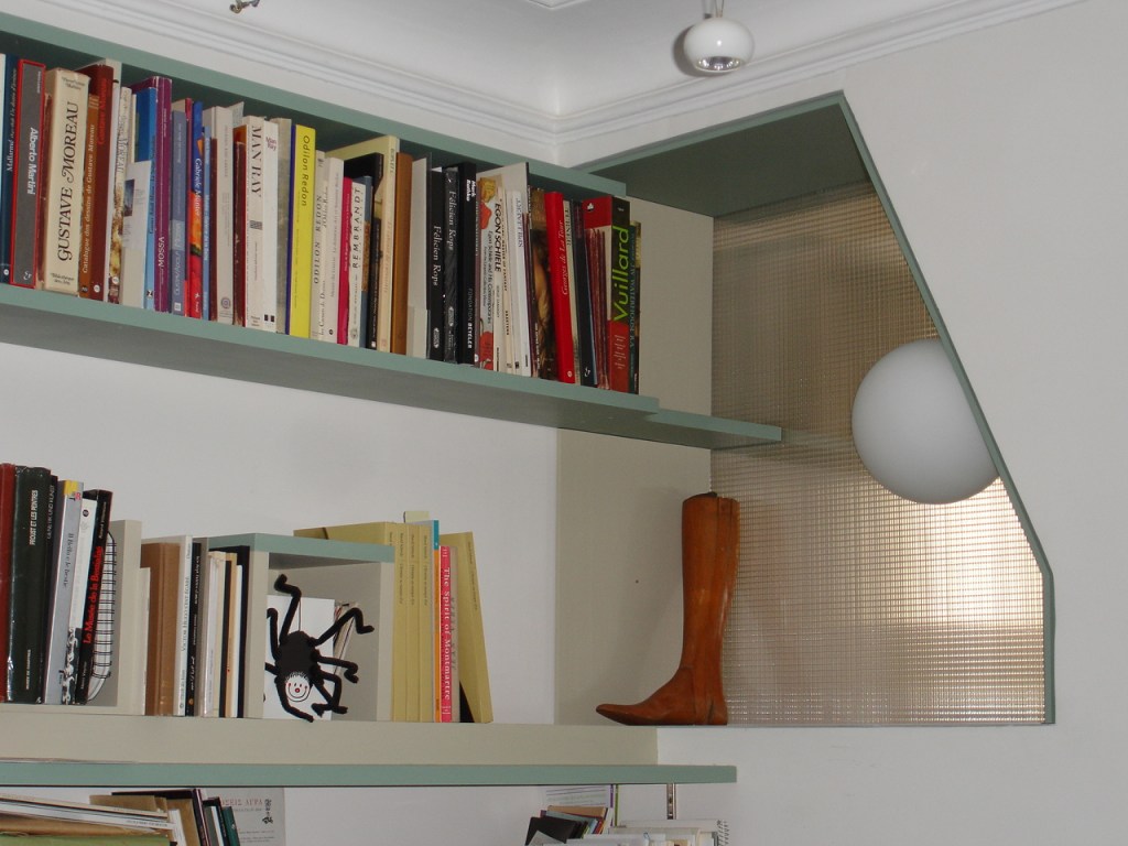 Simple free-standing constructions, in cut-to-size ply or MDF (painted or varnished), composed of risers, stretchers, top-plates, bracing panels & inter-mediary shelves, either faced with doors or not, make for a bespoke modular fit-out that is 100% retrievable in the event of moving. Model first devised for a private Parisian library, then adapted in Nice for my own storage & sleeping platform rerquirements.