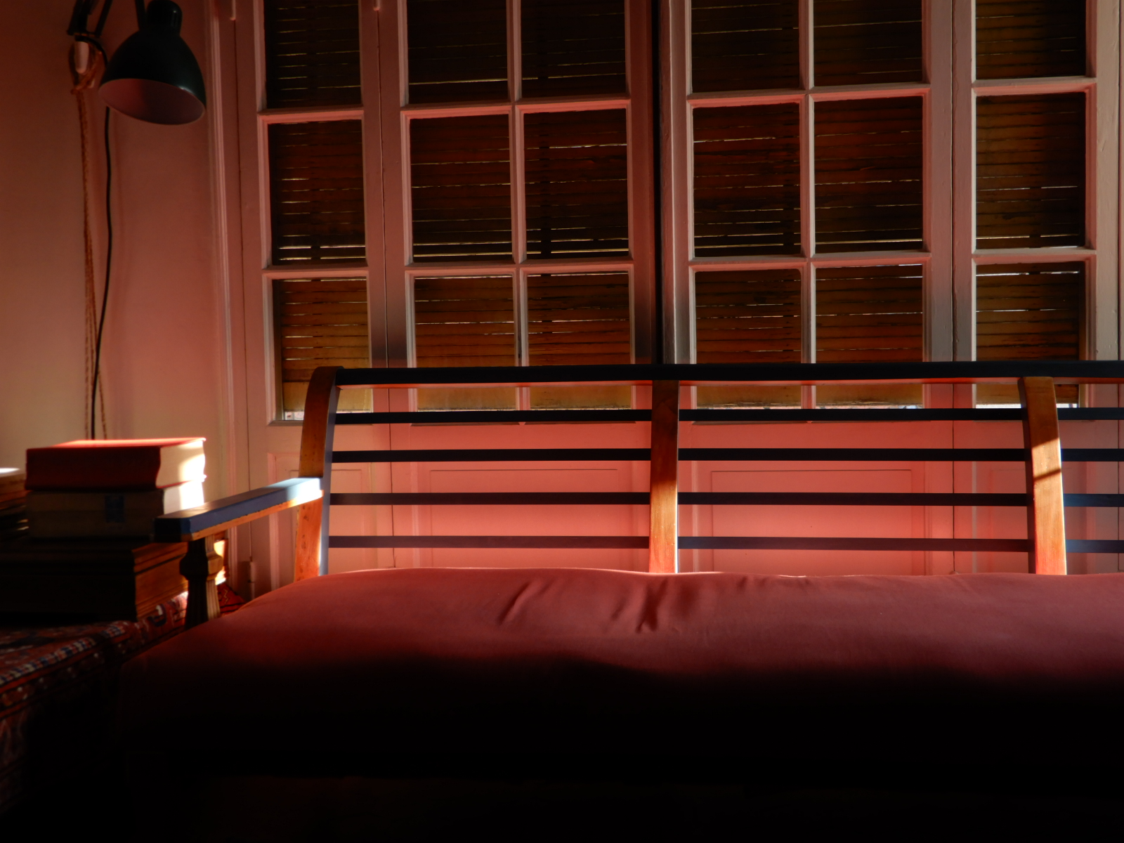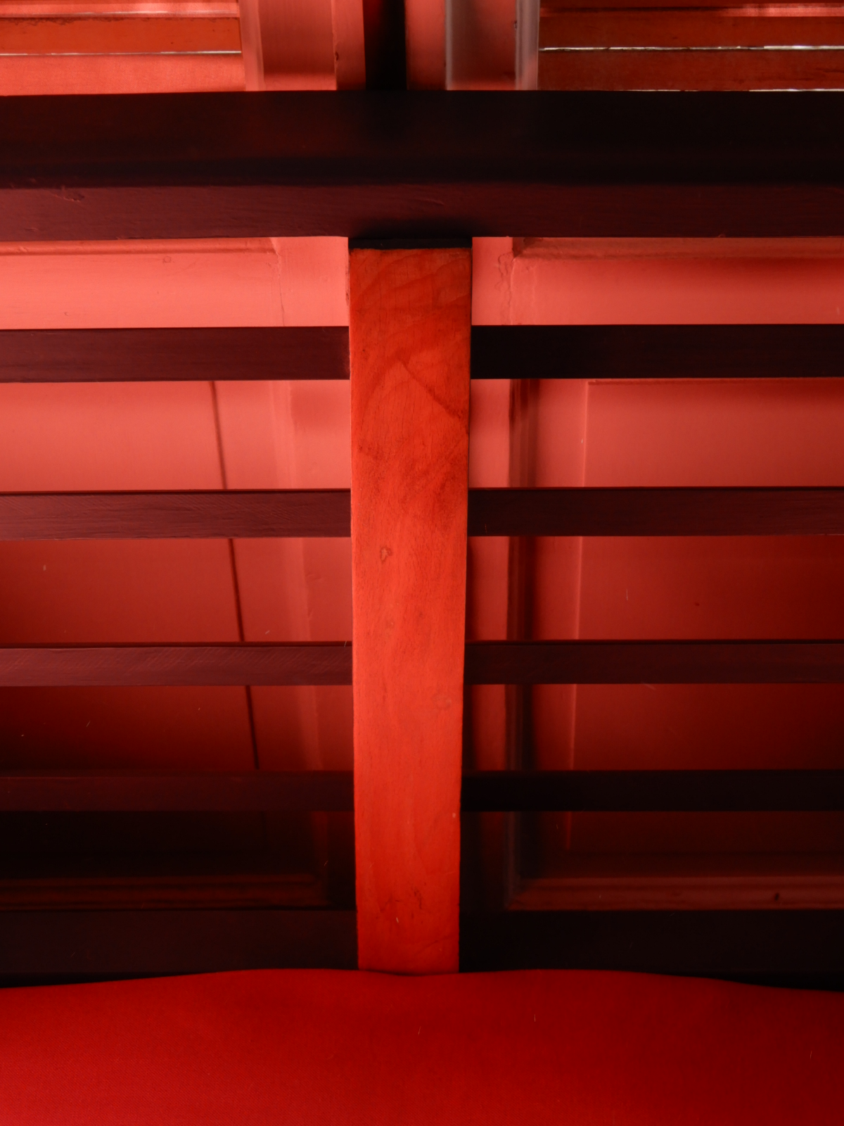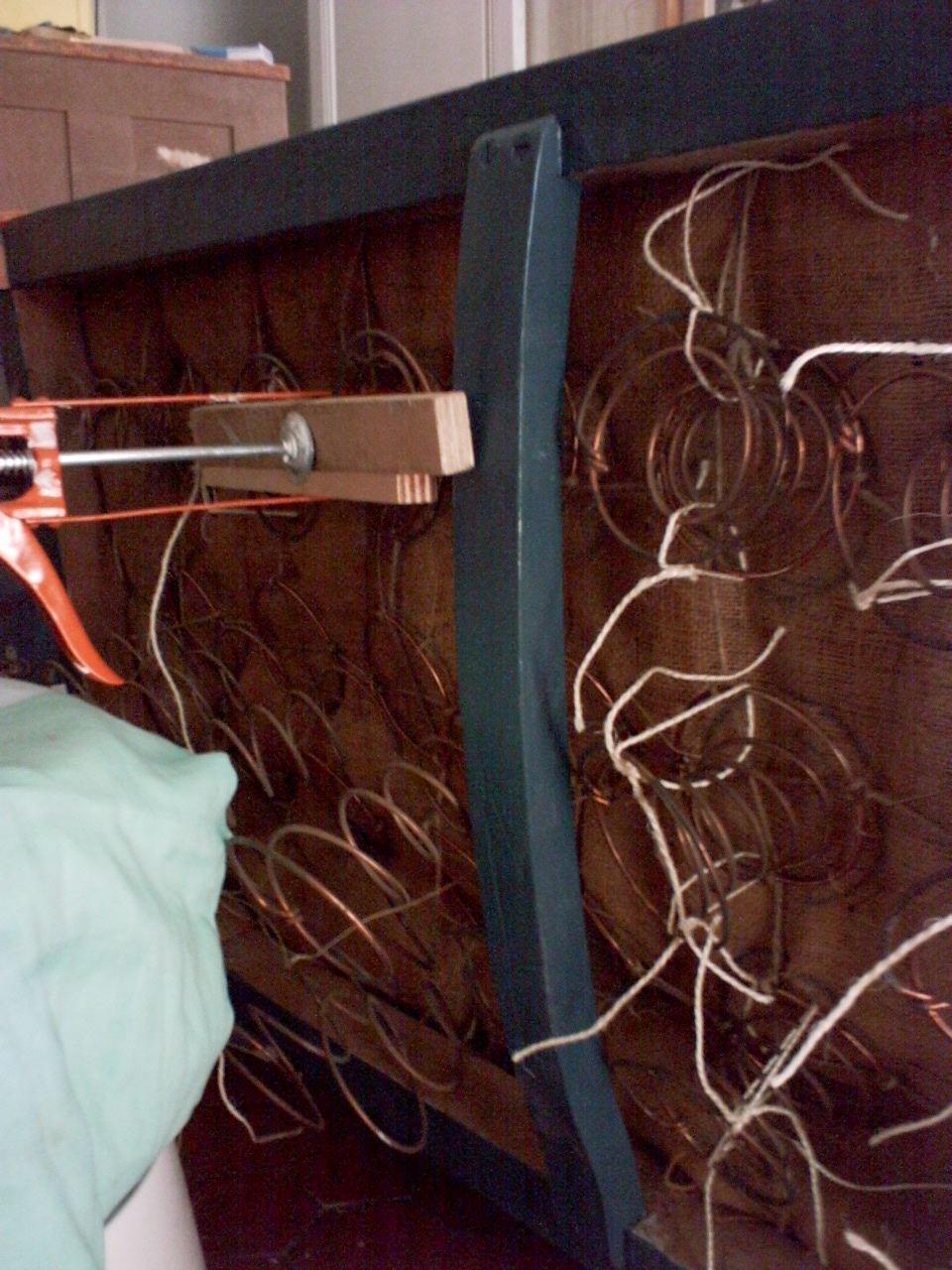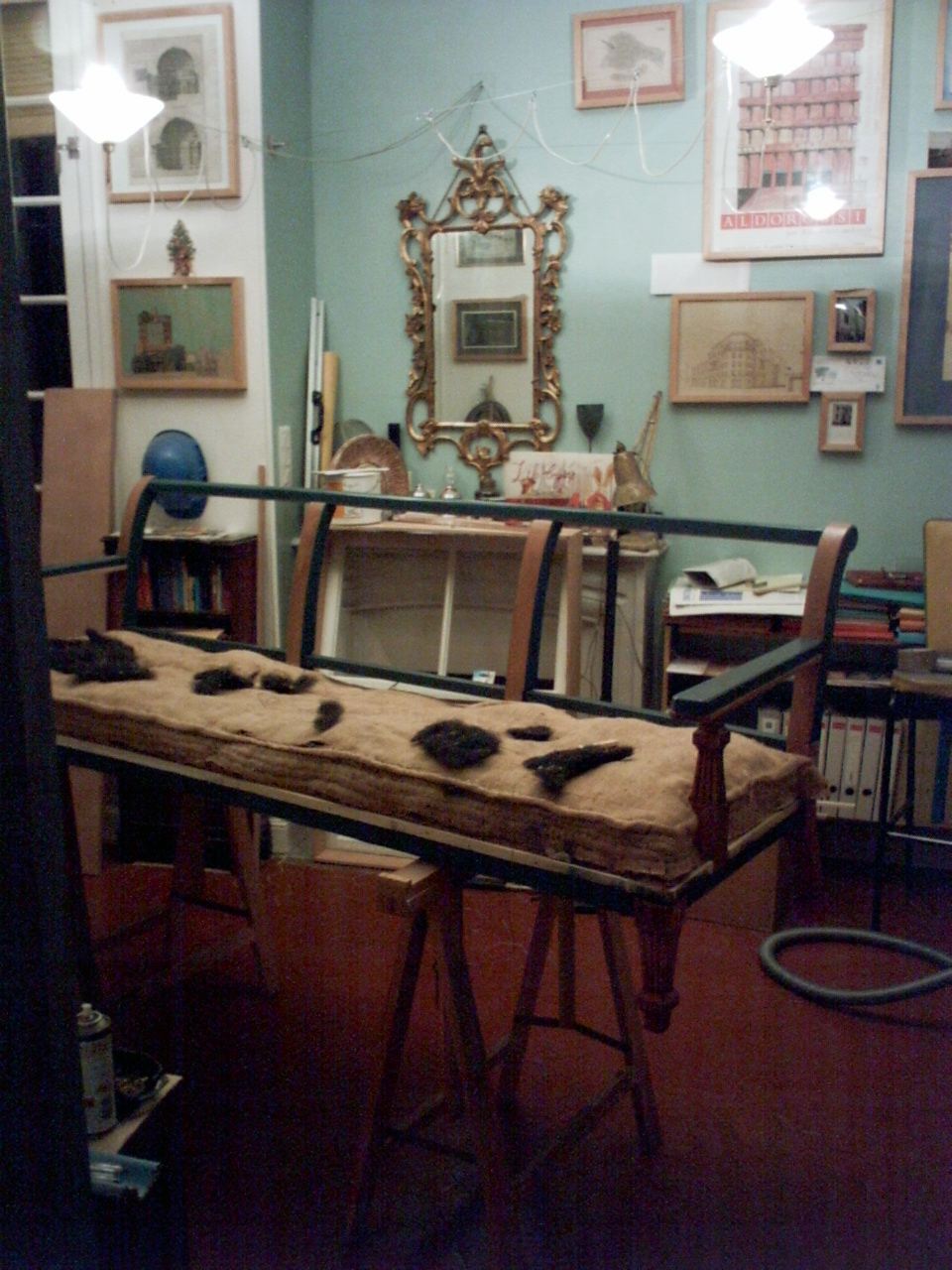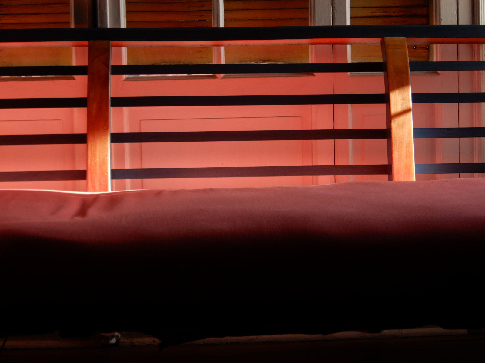 At the instigation of my friend the designer Sarah STALLARD, I had bought this long shallow settee in early 1980’s Portobello, as a bed-length kip-down for overnight charrettes in a future office. 20 years and several households’ use later, I stripped it back to the bones, added slats to the backrest and re-upholstered the seat. A gain in depth, comfort, elegance & flexibility, cushions replace the formerly upholstered & buttoned backrest.