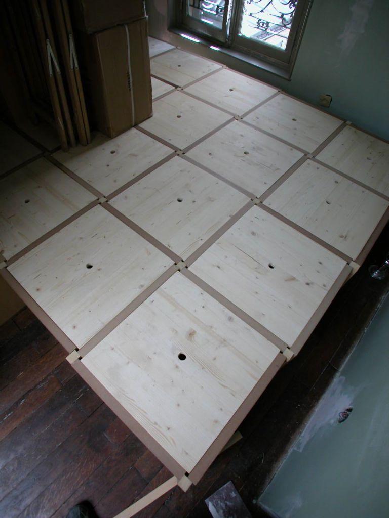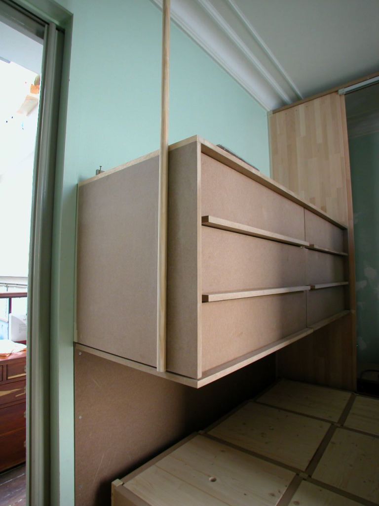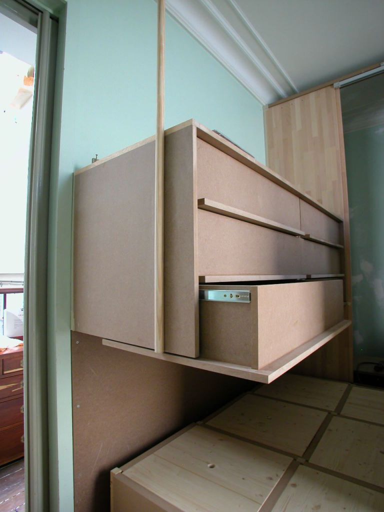 Lovely large cuban mahogany wardrobes in a small bedroom had proven impractical, and the only way to recover the lost storage and increase the floor area for a futon mattress was to build storage modules below the tatami mats. Built with the assistance of Sophie POENOU.