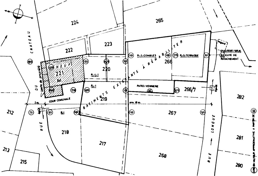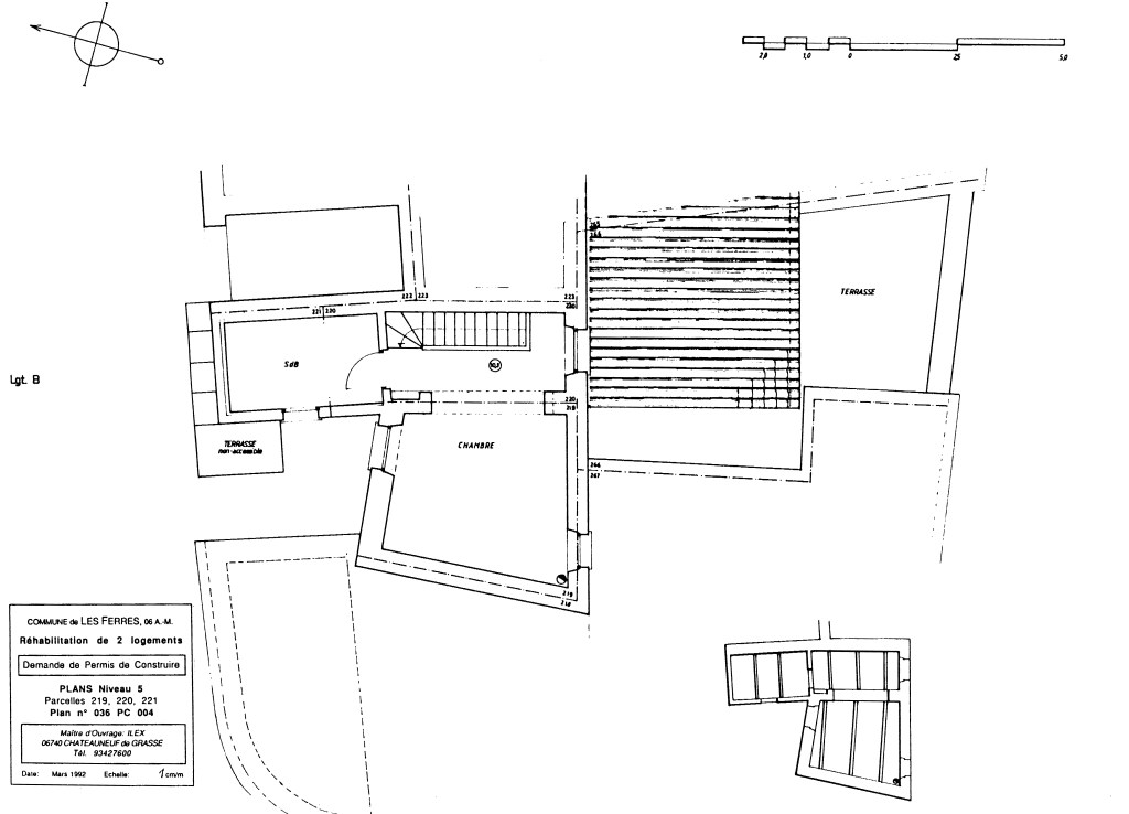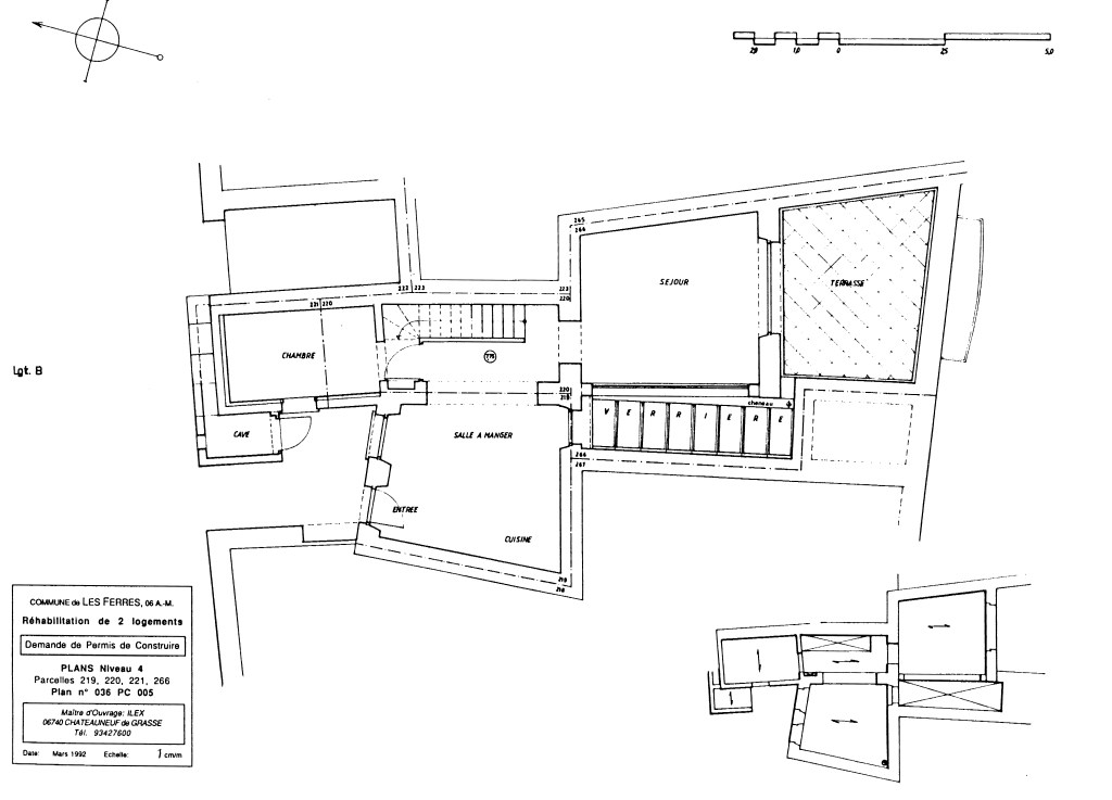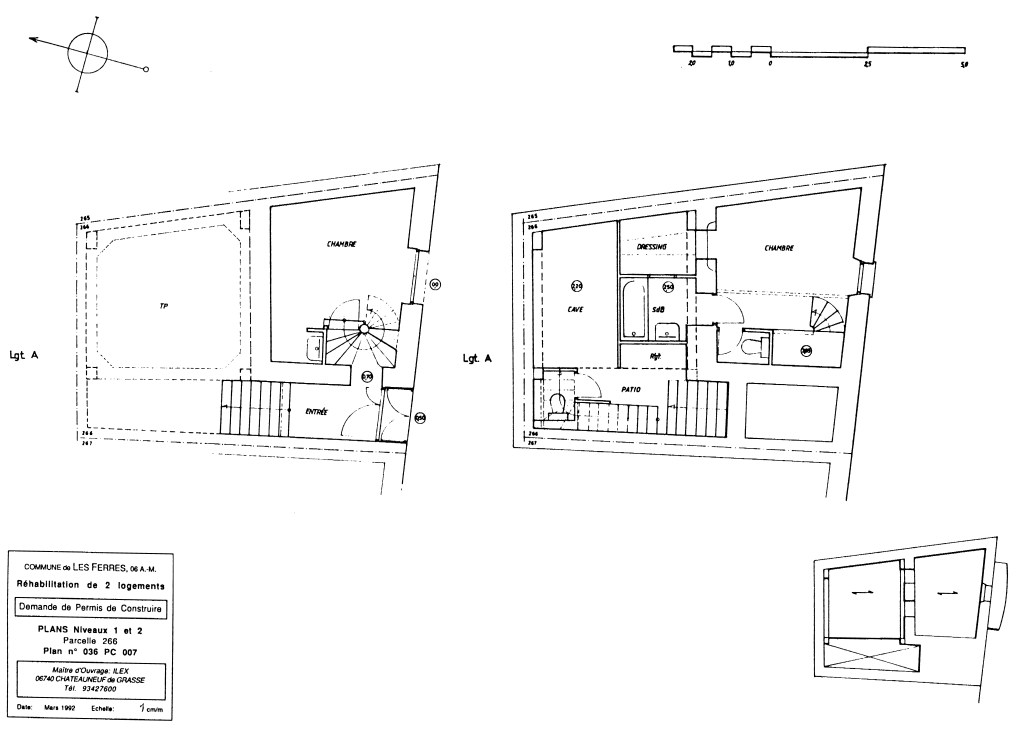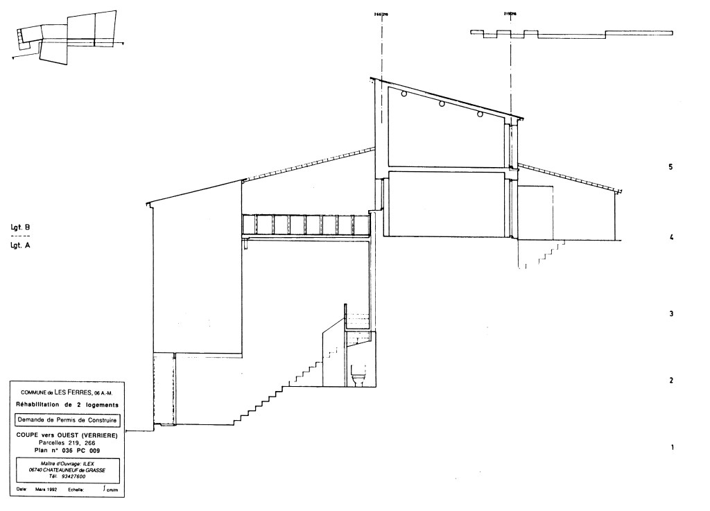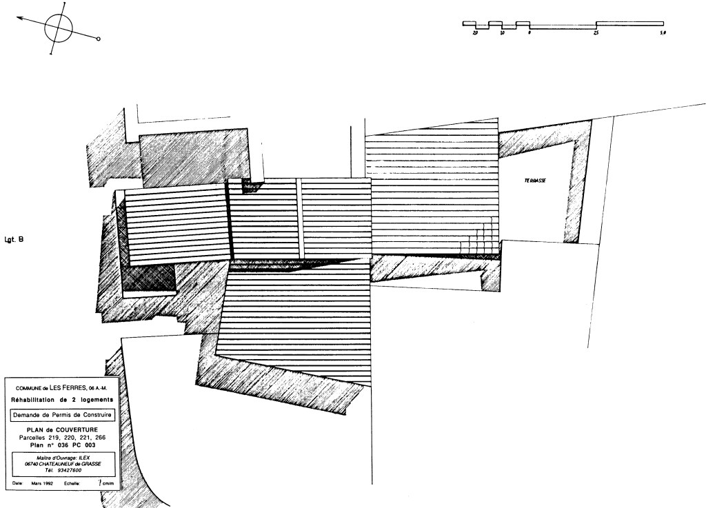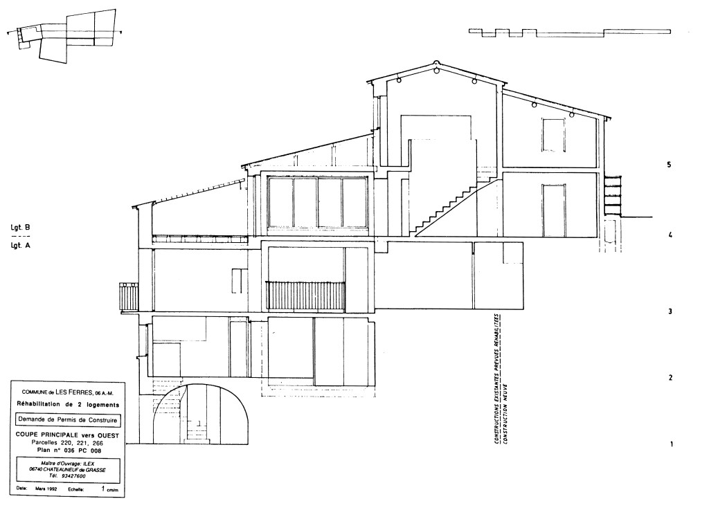 Avant que je ne mette pied à l’école d’architecture, ma mère achetais des propriétés dans le midi, pensant les faire retaper et vendre. Un maçon, Antoine PRANDI, qui deviendrait un très cher ami de famille par la suite, en achetait aussi, pour pouvoir chasser sans entrave dans toutes les communes sur ses parcours. Par son biais, me semble-t-il, ma mère avait fait rénover une propriété à Les Ferres, rue du Château, sur projet d’un maître d’oeuvre, Monsieur ESCOFFIER, qui fut vendue. De là l’achat de ces parcelles limitrophes, en état de ruine, dont il m’échoua, une quinzaine d’années plus tard, la tache d’imaginer une solution architecturale d’ensemble, pour la Société ILEX, marchand de biens & maître d’ouvrage commanditaire du dossier en demande de Permis de Construire.