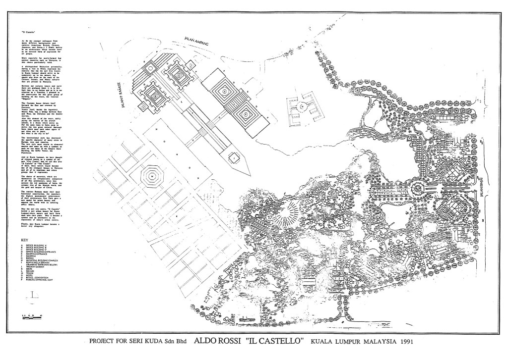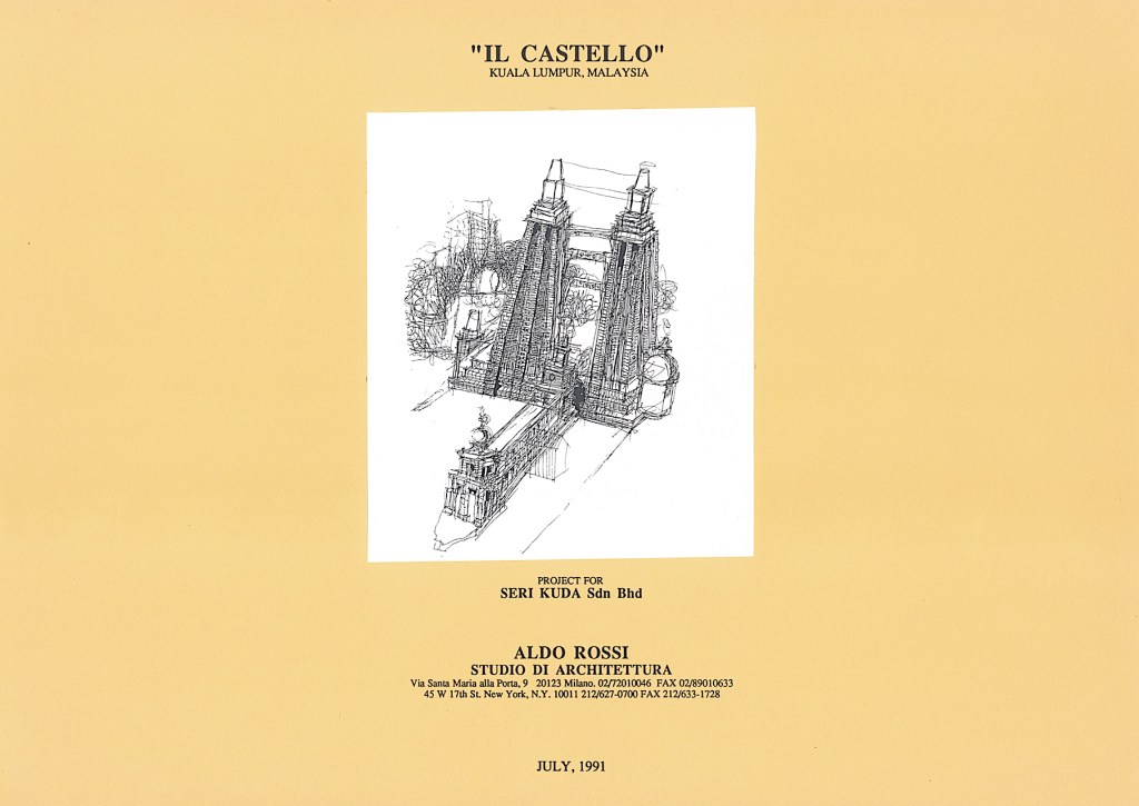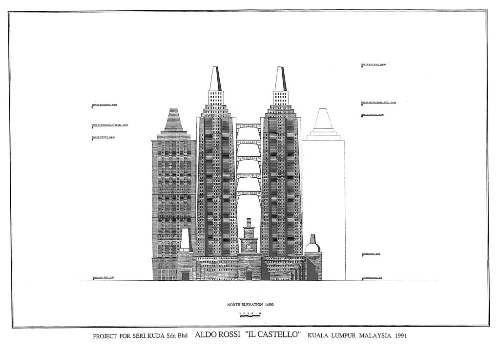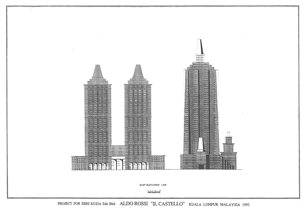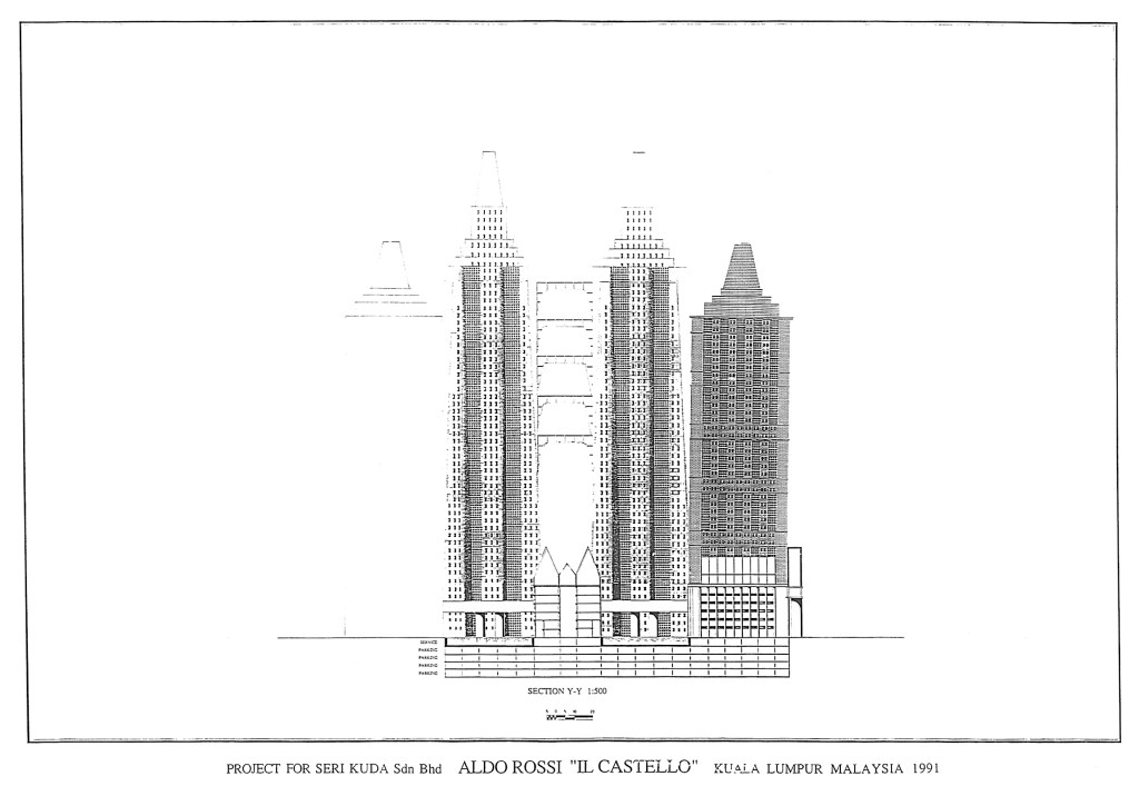 Progetto di concorso (privato, ad invito) di Aldo ROSSI, con l’architetto Luca TRAZZI, si tratta in realtà delle future Torri PETRONAS finalmente compiute da Cesar PELLI.