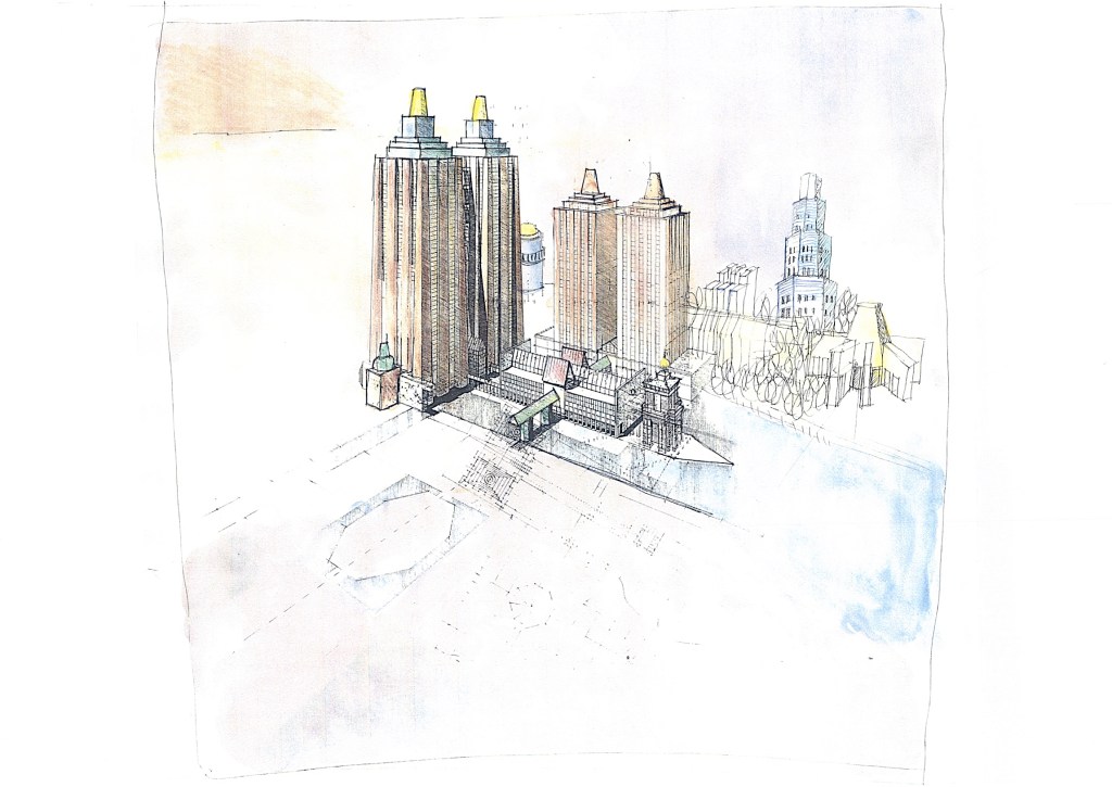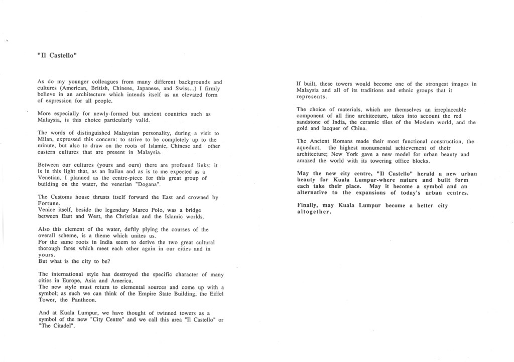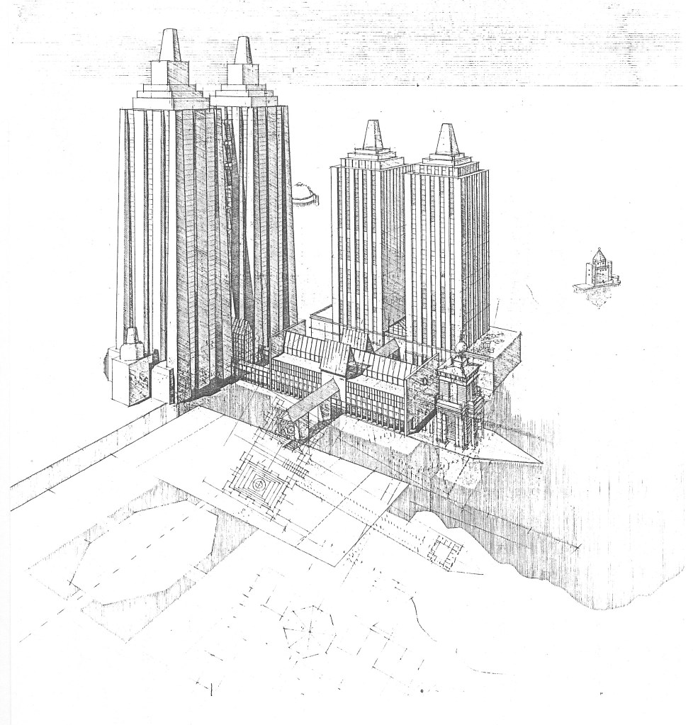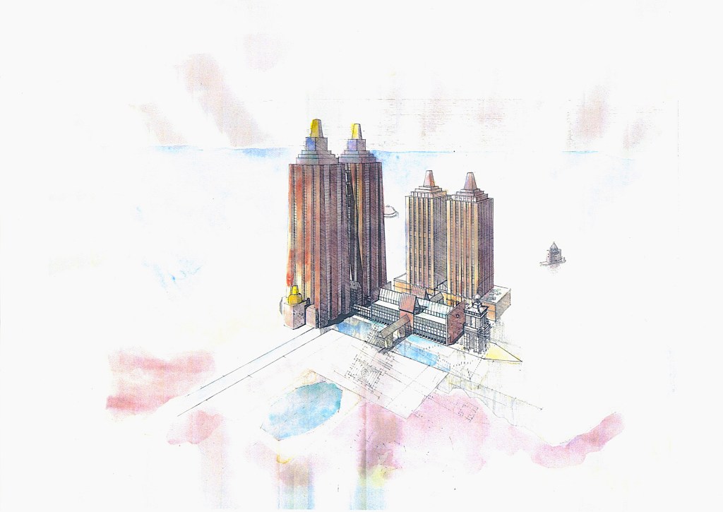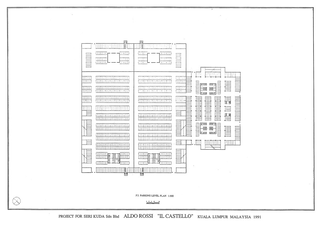 Progetto di concorso (privato, ad invito) di Aldo ROSSI, con l’architetto Luca TRAZZI, si tratta in realtà delle future Torri PETRONAS finalmente compiute da Cesar PELLI.