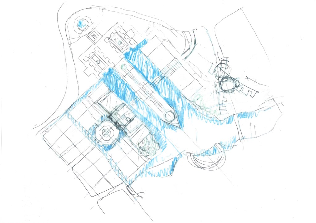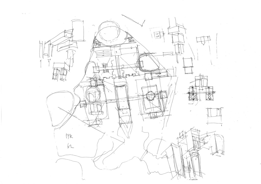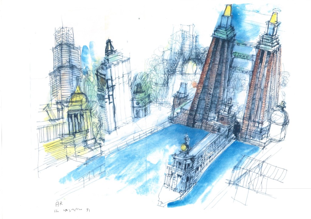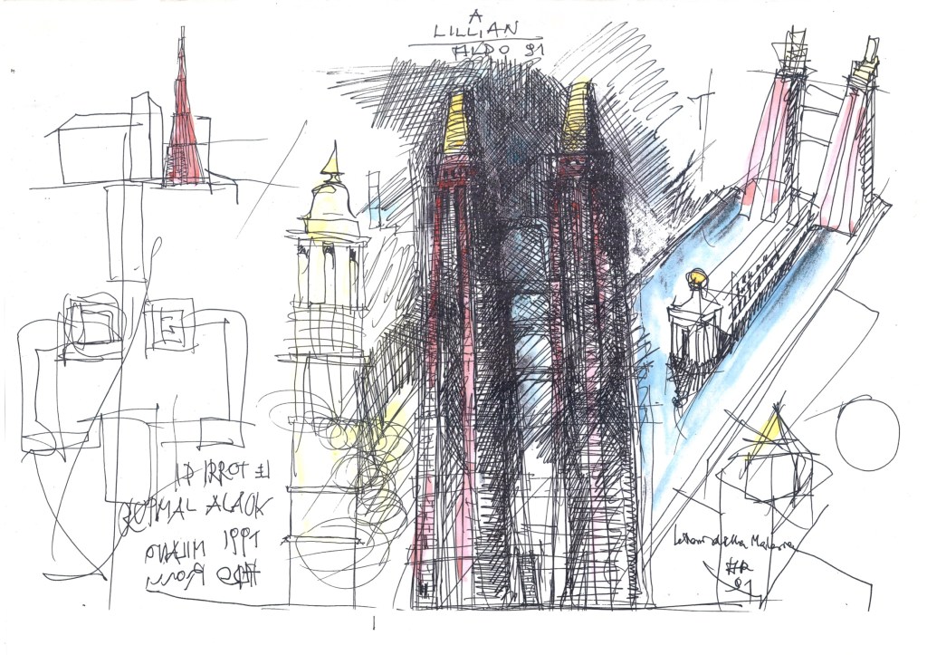 Al mio arrivo a Milano, si studiavano i singoli componenti (torri ecc.) ma la planimetria generale non era ancora stabilita. Per intraprendere la prospettiva che mi era stato chiesta, ho dovuto imporre qualche grande linea in base agli schizzi di Aldo ROSSI.
