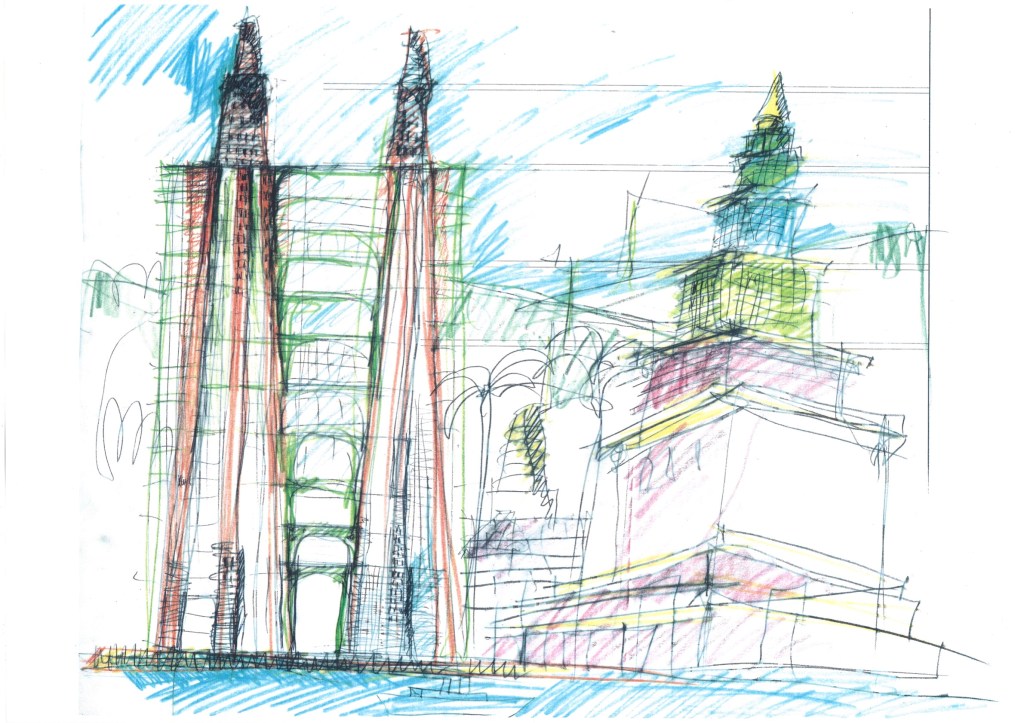 Stupito, Aldo ROSSI mi ha chiesto perché avevo colorato di verde, nello schizzo che ha sovrapposto alla mia prospettiva, il paralelipipedo ottagonale (specie di firma sua) che ci aveva incluso. Gli ho risposto : perché la Malaysia è un paese dell’ Islam.