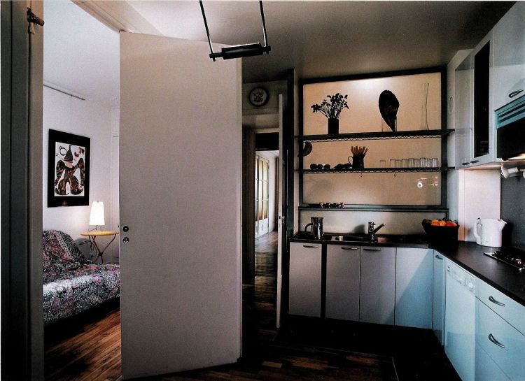 Delle anti pieghevoli rimpiazzano e servono da parete divisoria per coinvolgere la stanza degli ospiti con la cucina e meglio illuminarla in assenza di visite.