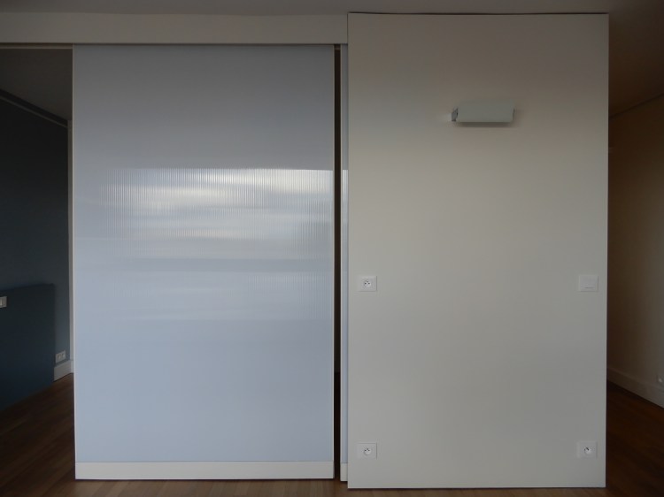 Dei panelli di policarbonato spariscono dietro una partizione.