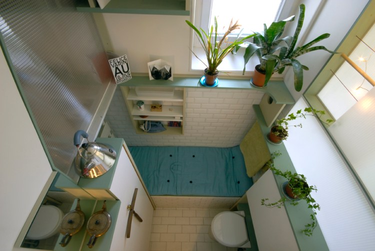 An existing bathroom split, screened and bespoke furnished, the bath serving as daybed.