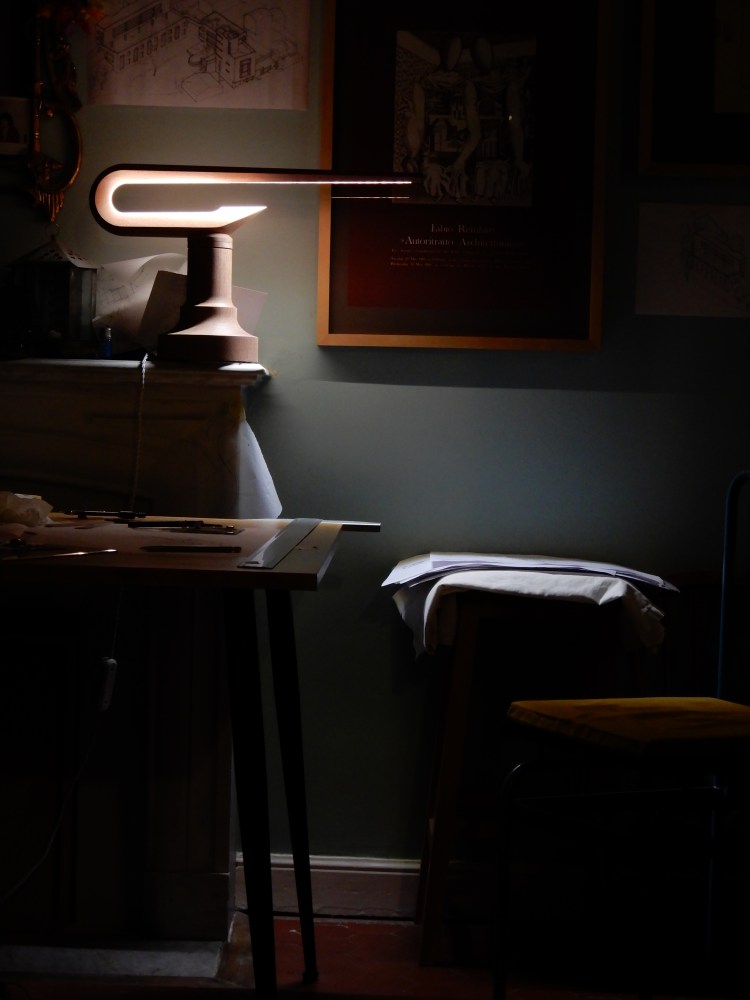Piano di lavoro e da esposizione / conservazione di plastici (sulla mensola inferiore) per architetto.