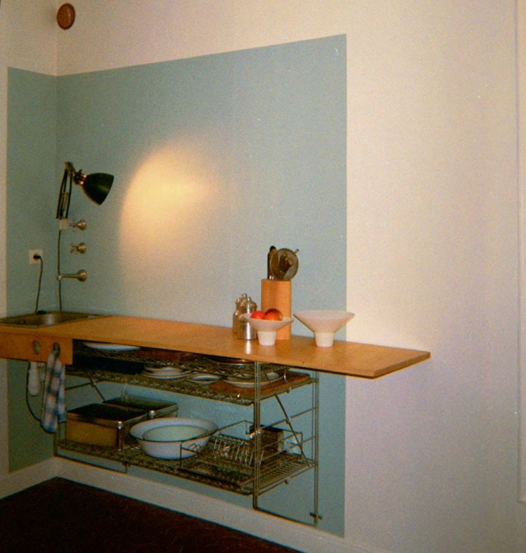 Un’ unico tubo (eventualmente rinforzato all’ interno) sostiene degli scaffali, serve da appendi-abito nel armadio, per schermare il letto con una tenda, e da ancoraggio rispetto allo sbalzo.