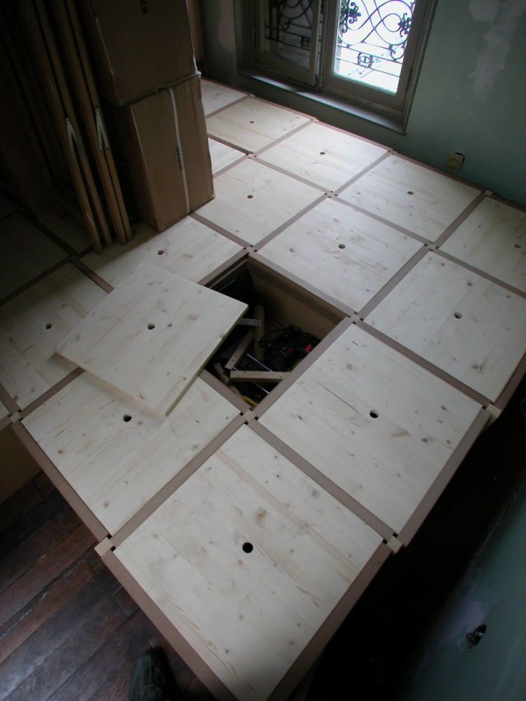 Contenitori di stoccaggio individualmente accessibili in un’ appartamento parigino, sottostante ai tatami di una camera da letto, che coprono 10 dei 12m2 della stanza.