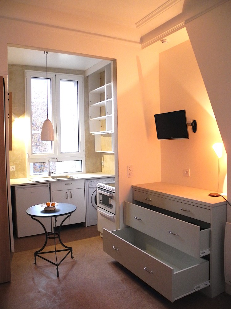 Cassetti e mensole integrati per il pied-à-terre parigino di un cliente politico.